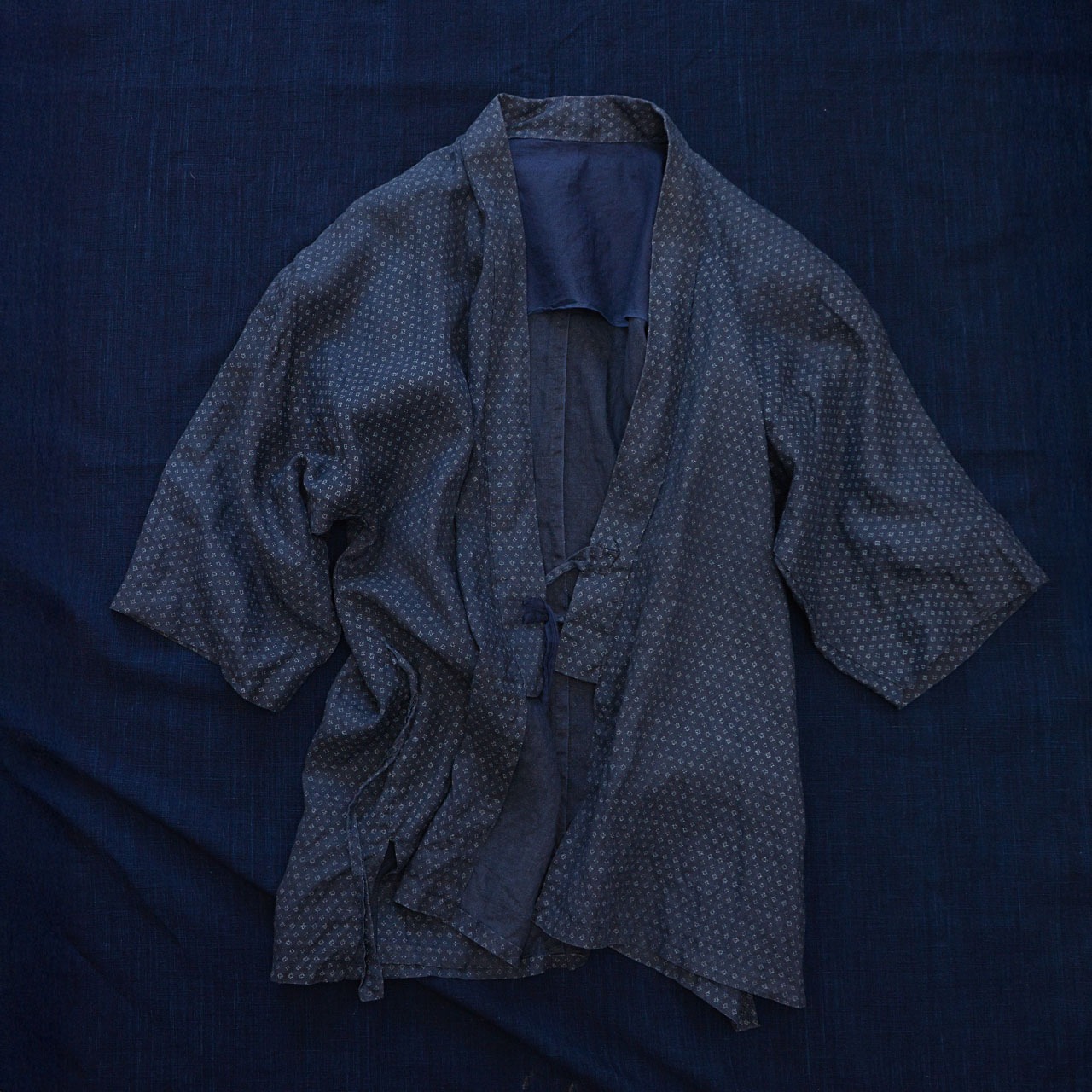 今回ご紹介するのは、昭和初期〜中期にかけて作られた綿麻素材の野良着(上っ張り)です。軽やかで通気性の良い綿麻地に、繊細な小紋柄が全面にあしらわれた一着。羽織紐付きで着脱も簡単、カーディガンやジャケット感覚で現代の装いにも自然に馴染みます。