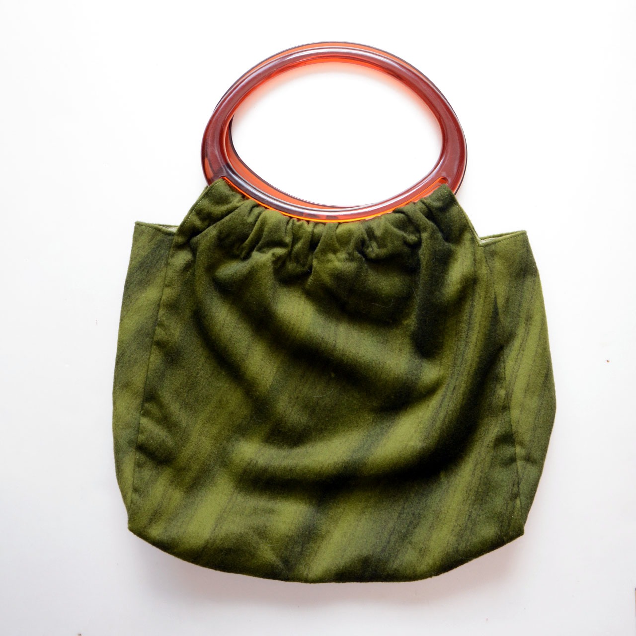 このバッグは、持ち手にプラスチック製のリングを用い、フェルト生地で作られたものが多く、当時としてはモダンで遊び心のあるデザインでした。丸みを帯びたフォルムと大きなリングの組み合わせは、洋服にも合わせやすく、若い女性や主婦層まで幅広く使われました。まさに、昭和の暮らしの中で日常使いとして親しまれたアイテムです。