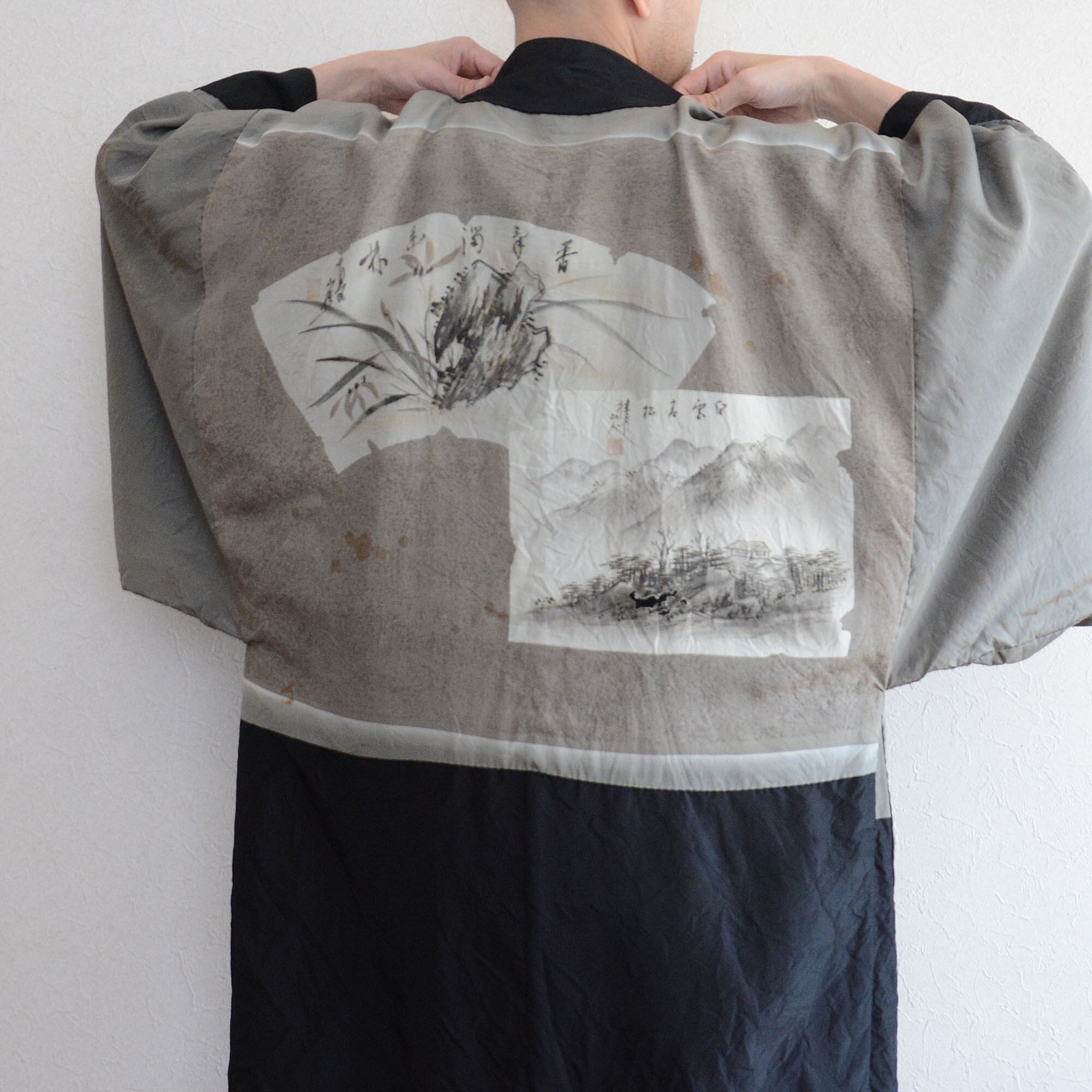 Black Haori Jacket Kimono Long Japanese Vintage Montsuki Nihonga Art | 紋付 長羽織 黒 アンティーク着物 ジャケット ジャパンヴィンテージ 昭和 リメイク素材