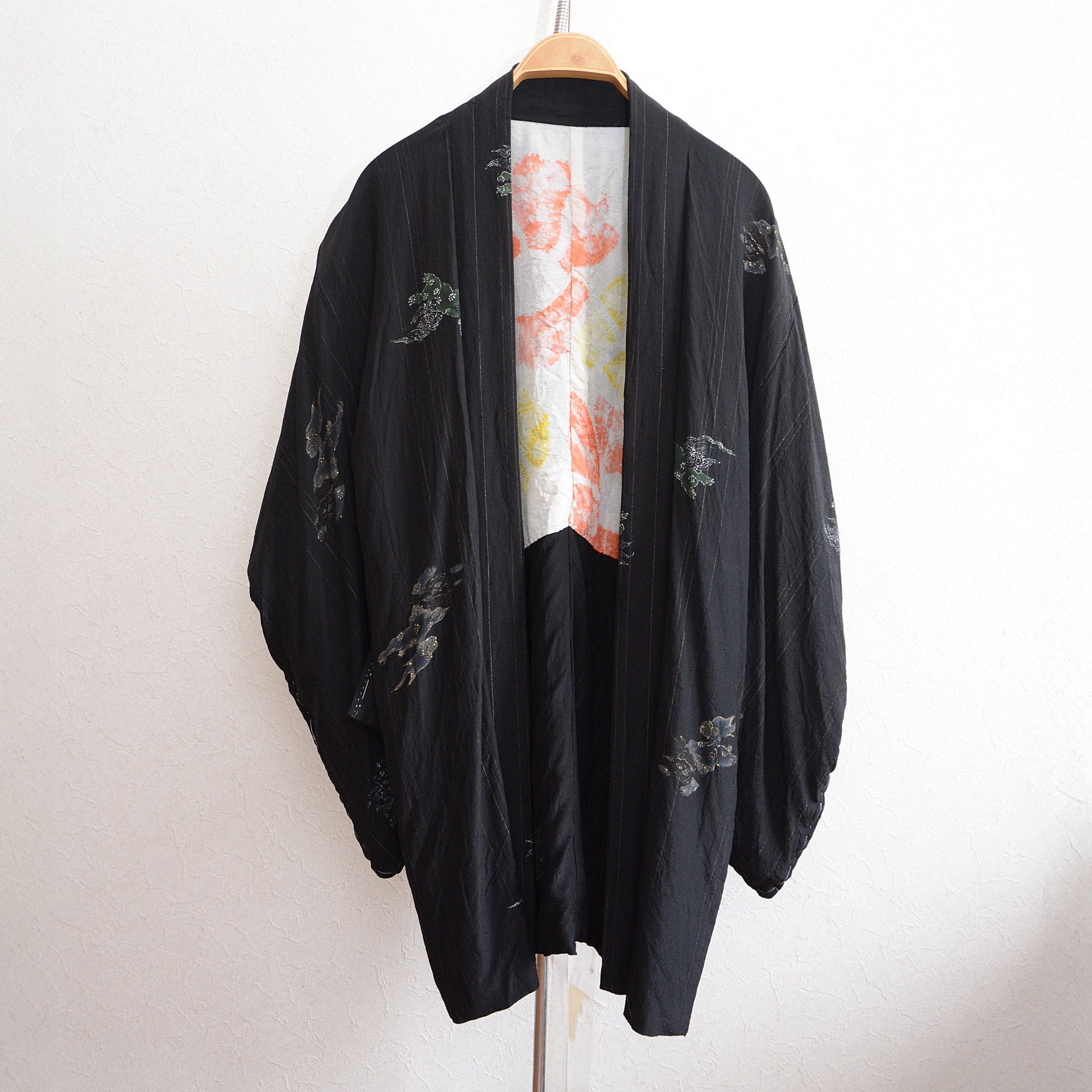 Haori Kimono Japanese Vintage Jacket Black Karashishi Multi Pattern | 羽織 着物 ジャケット 黒 唐獅子 マルチパターン アンティーク着物 ジャパンヴィンテージ 昭和 リメイク素材