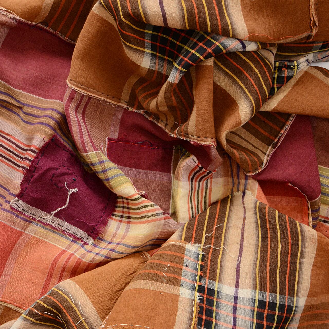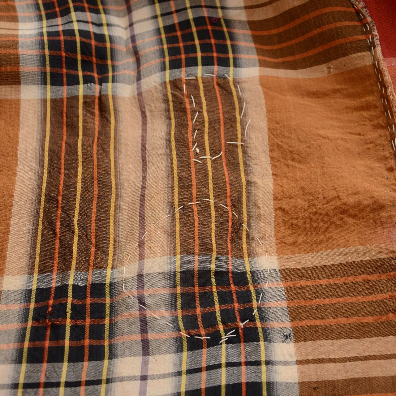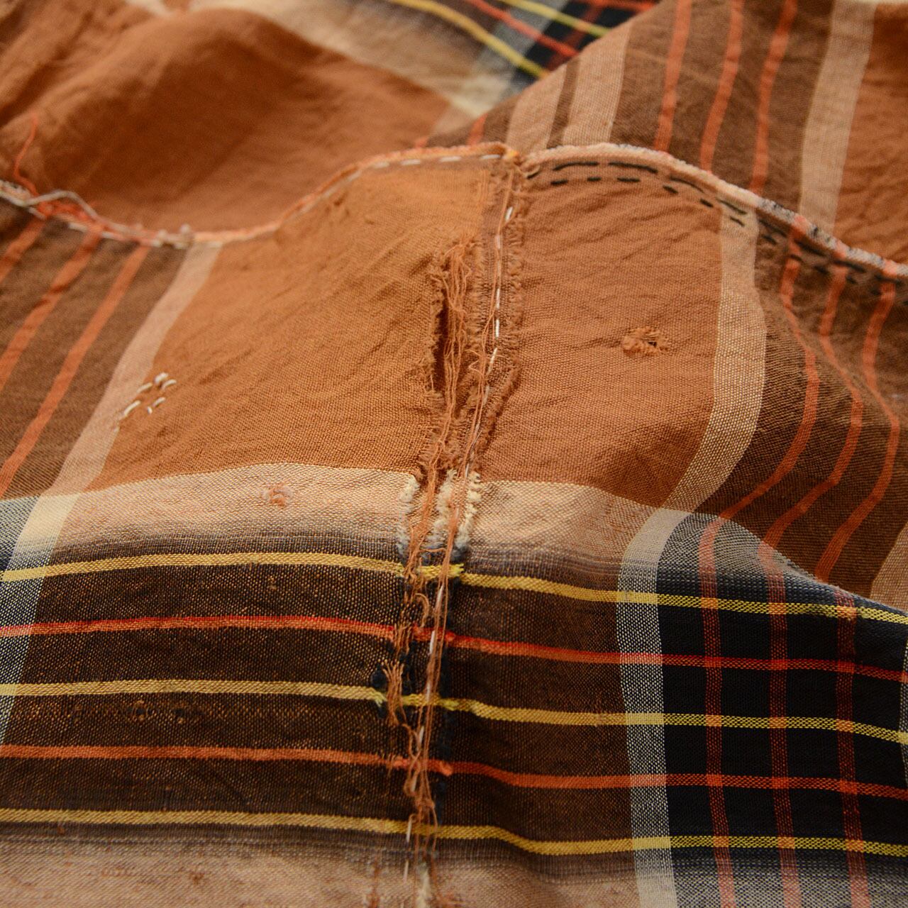 格子模様をベースに、複数の布が繋ぎ合わされたクレイジーパターン仕様となっており、見る角度によって表情を変える、まさに一点ものの存在感があります。