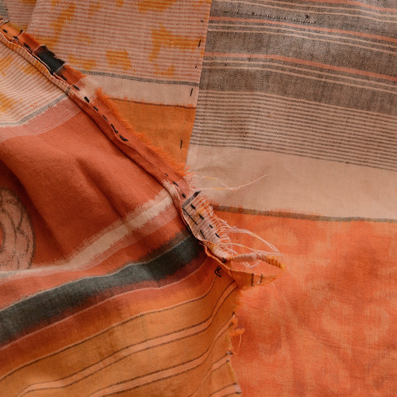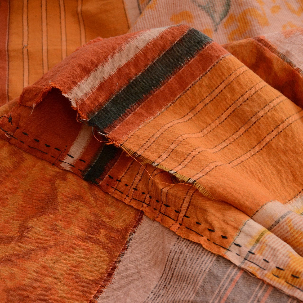 長年の使用を経て生まれた風合い、そして手縫いで施された襤褸(ぼろ)なリペア跡が、この布に独特の風合いと深みを与えています。