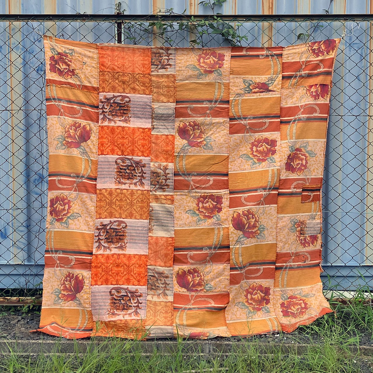 古布 木綿 布団皮 花柄 昭和中期 襤褸リペア 約177×179cm ジャパンヴィンテージ