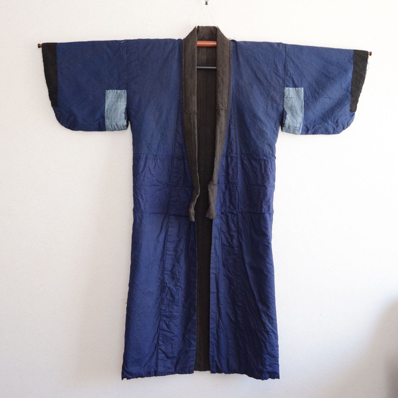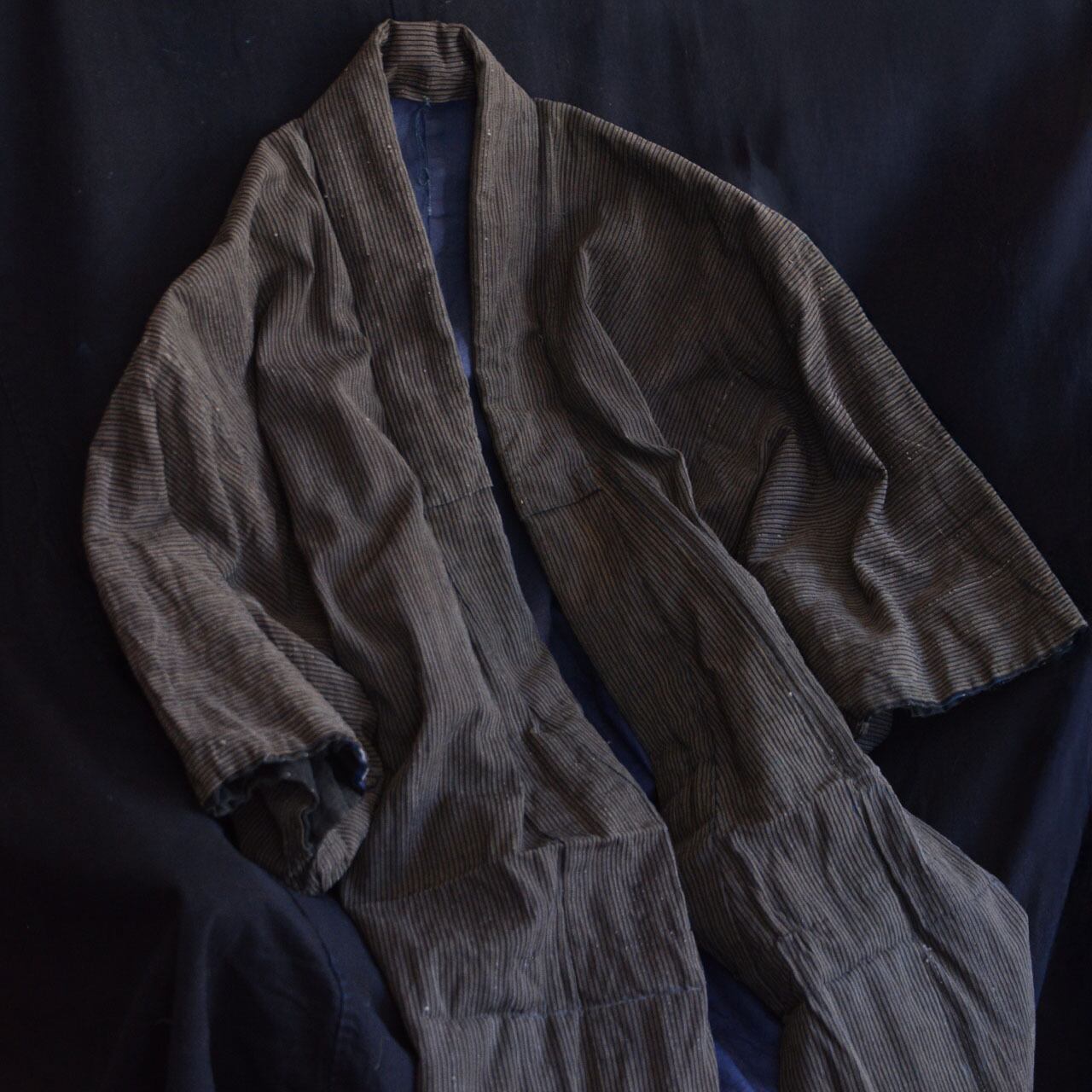 昭和初期〜中期 藍染 縞模様 木綿 長着 着物|ヴィンテージ 和装 ローブ リメイク素材にもおすすめ