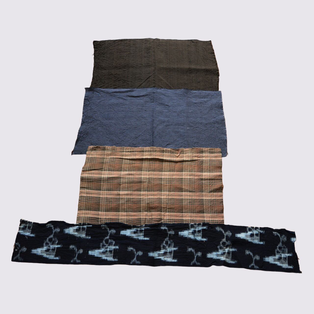 藍染の絣、素朴な縞模様、柔らかな風合いの格子模様、そして交織と思われる縞生地など、日々の暮らしを支えてきた布が4枚揃っています。