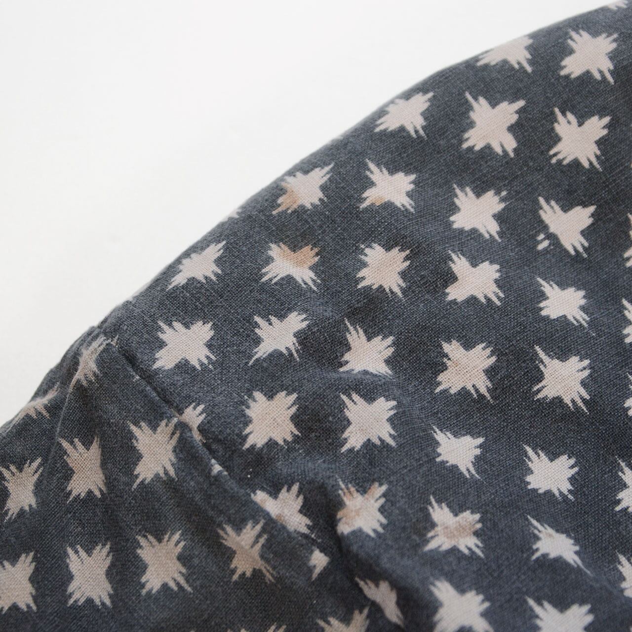 表地には素朴で温かみのある縞模様が広がり、裏地には星型やクロスのようなユニークなテキスタイルデザインが施されています。