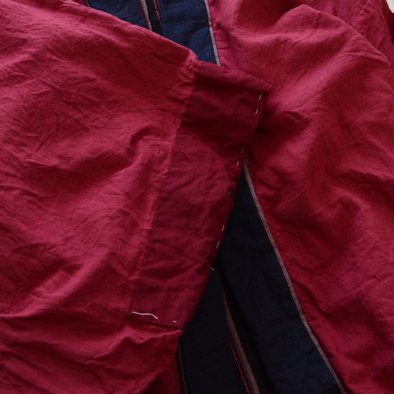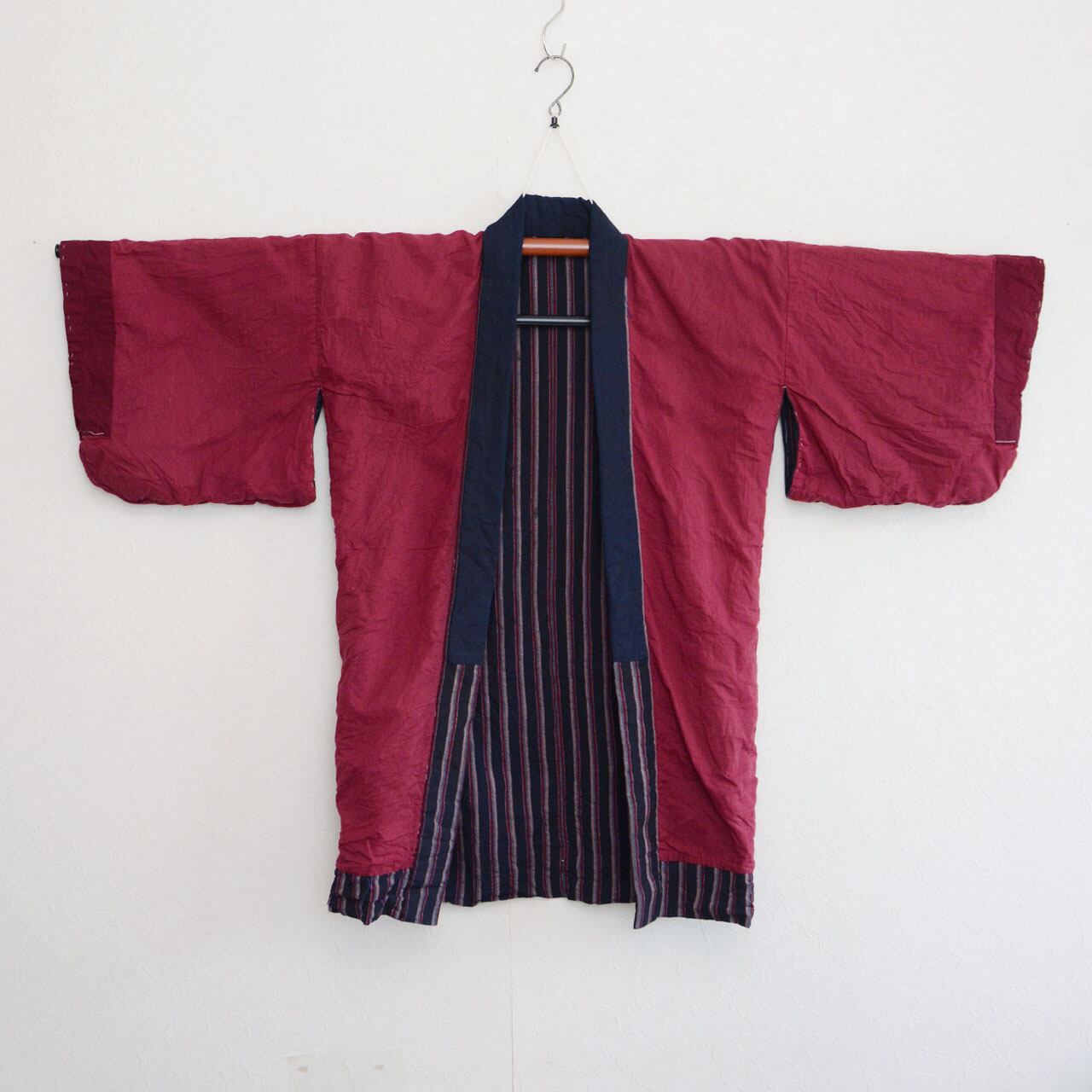 昭和中期 藍染襟の野良着|木綿 着物 縞模様 裏地マルーン ジャパンヴィンテージ