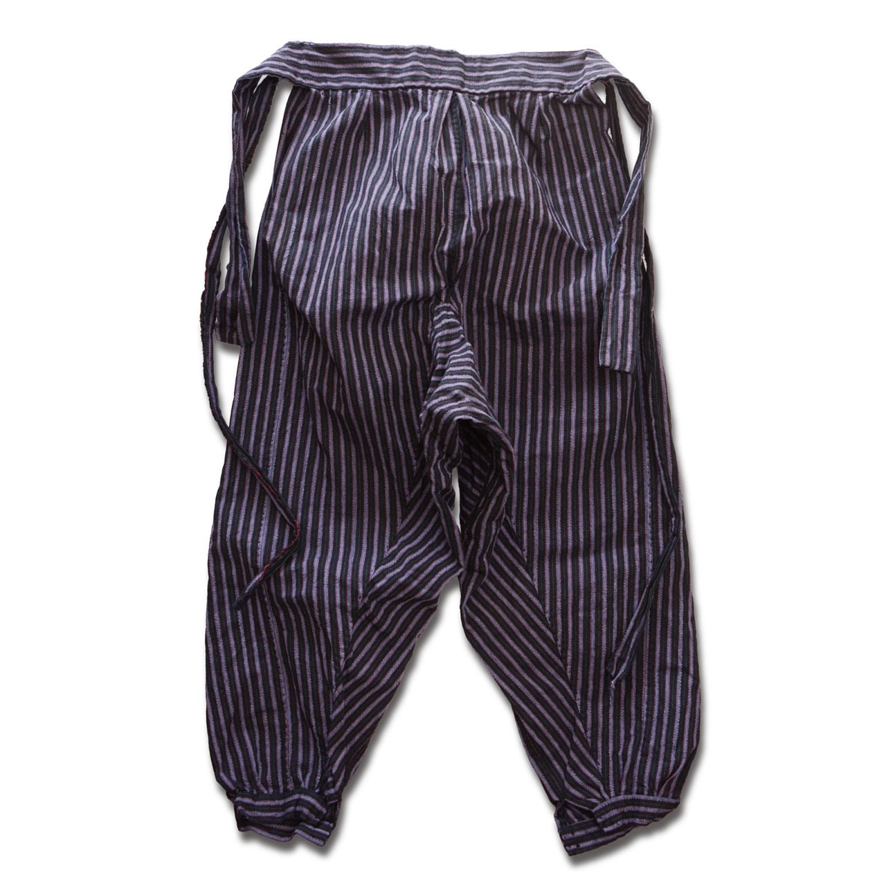 本品は縞模様の木綿地を用い、膝部分を補強したダブルニー仕様となっており、膝をつく動作の多い農作業を支えるための知恵が込められています。