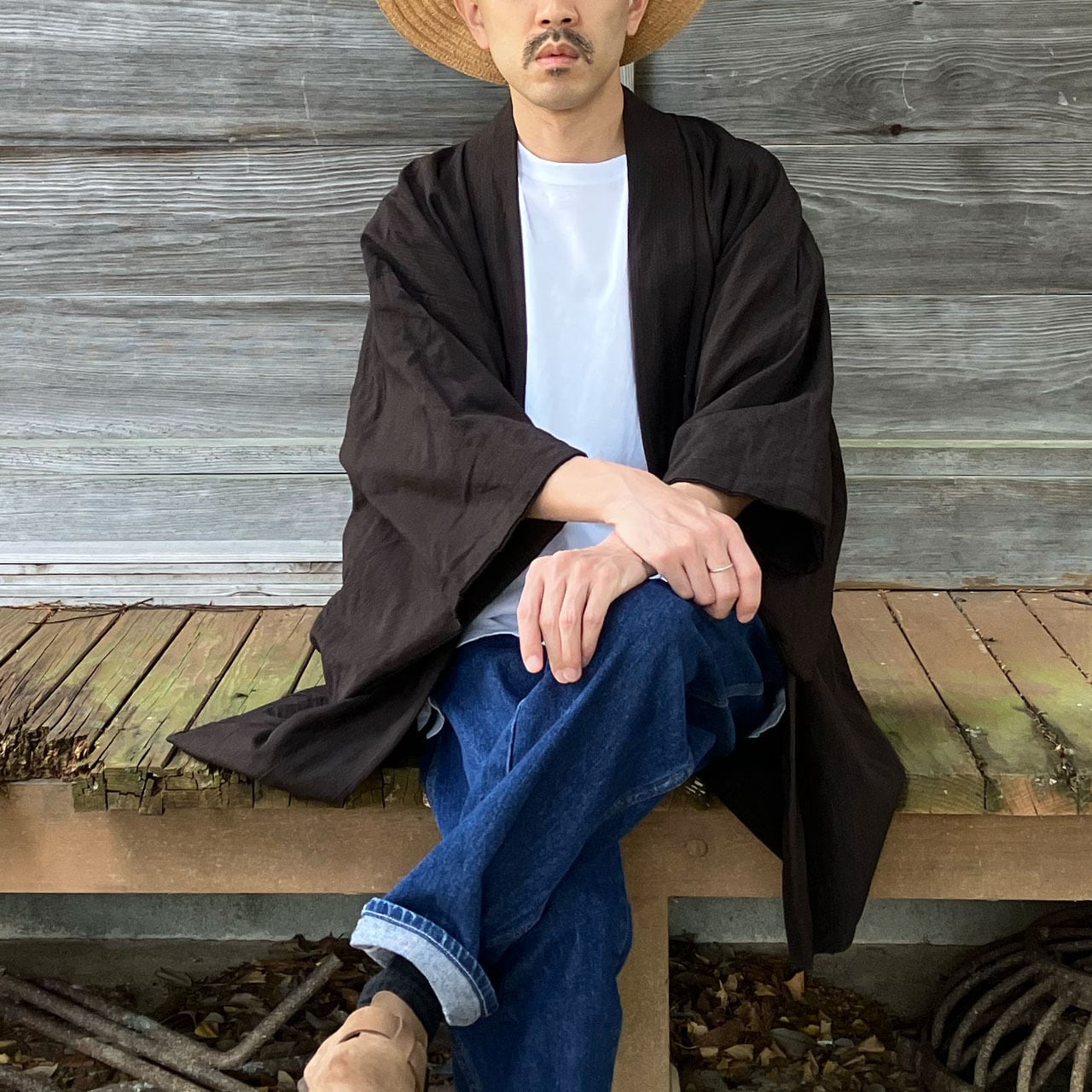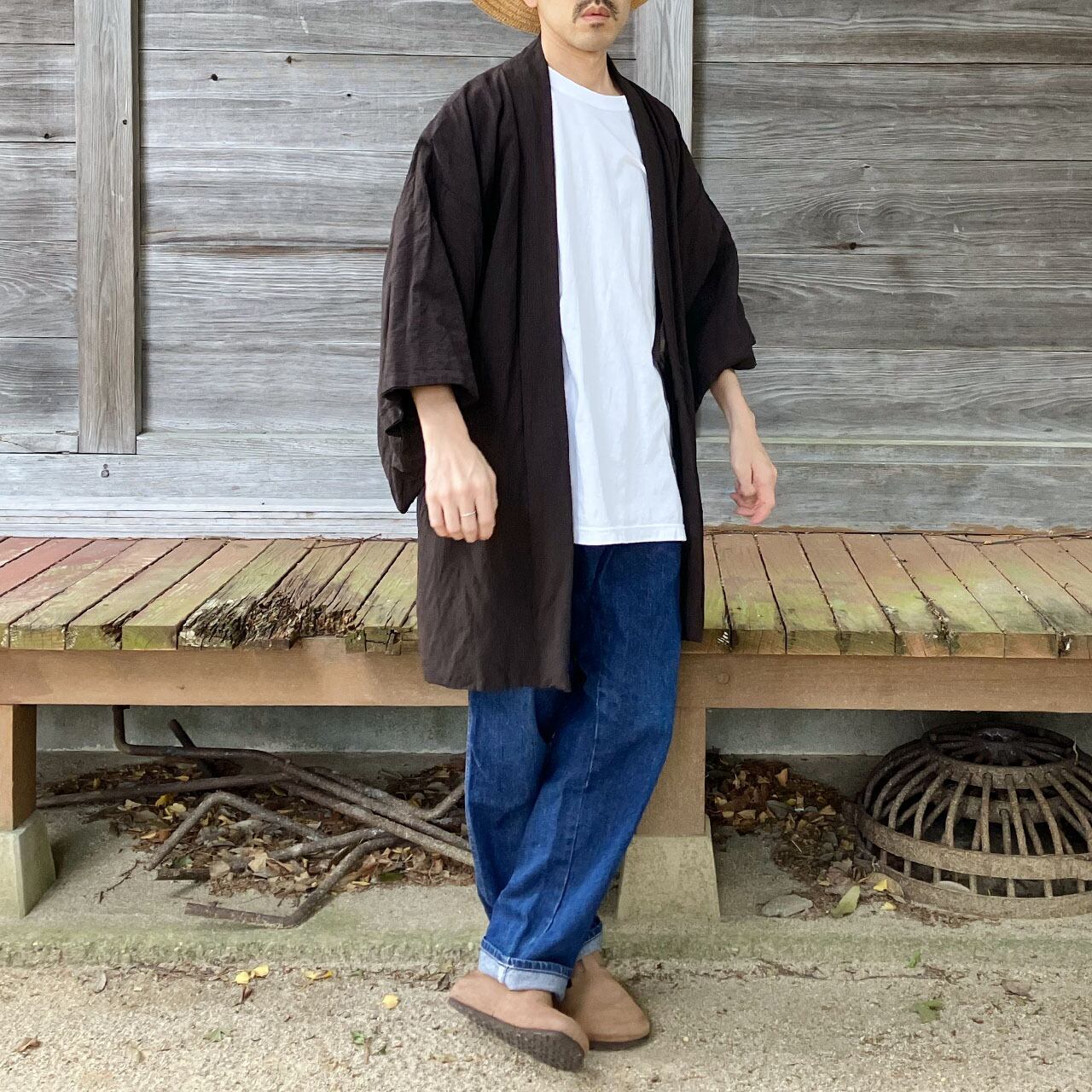 このブラウンチェック柄の羽織は、普段のデニムやチノパン、スニーカーと合わせるだけで、和洋折衷ならではの遊び心あるコーディネートを完成させます。