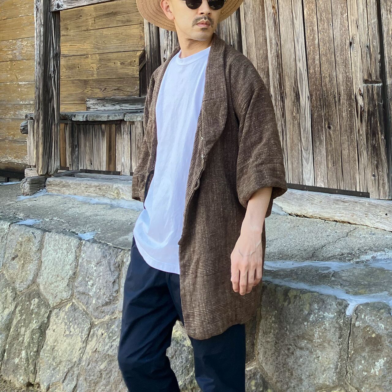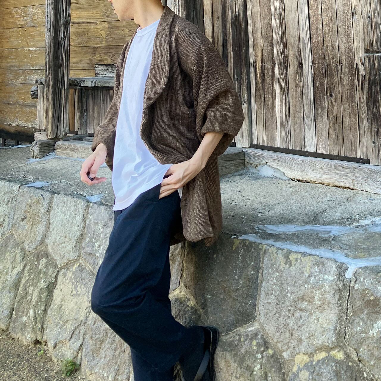 Tシャツやコットンパンツ、シンプルなカジュアルウェアに合わせるだけで、モード感のある和洋折衷スタイルが完成します。
