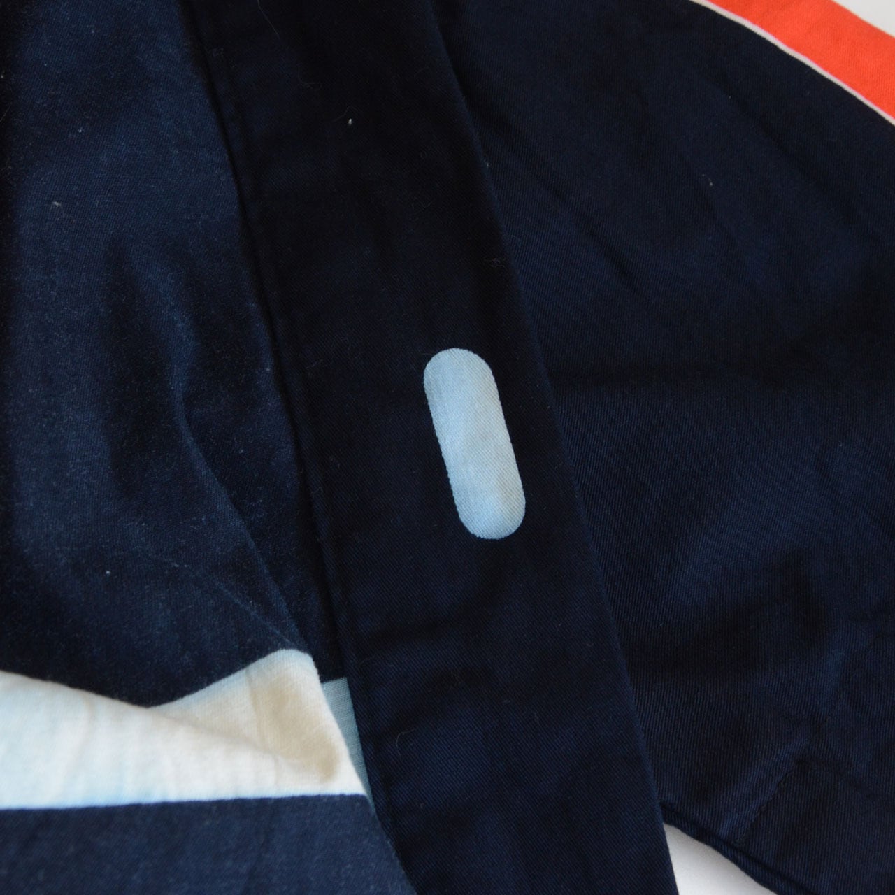珍しい濃紺の木綿生地に伝統的なライン入りのデザインが施され、昭和レトロな雰囲気を存分に楽しめる一点物。さらに、紐付き仕様は非常に希少です。