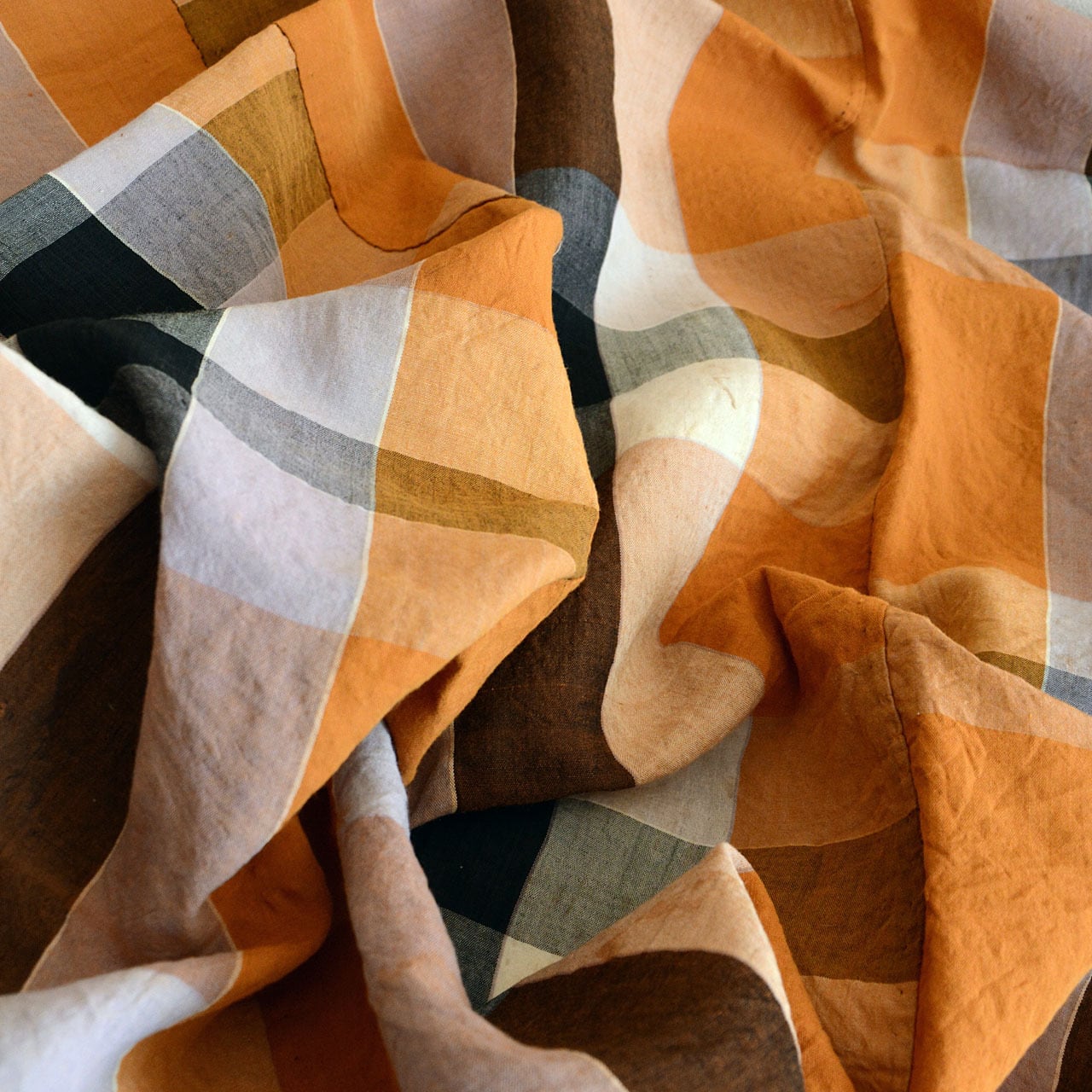 山吹色を基調とした格子模様は、やわらかで温かみのある印象を与え、時代を経た木綿ならではの優しい風合いが手に取るだけで伝わってきます。