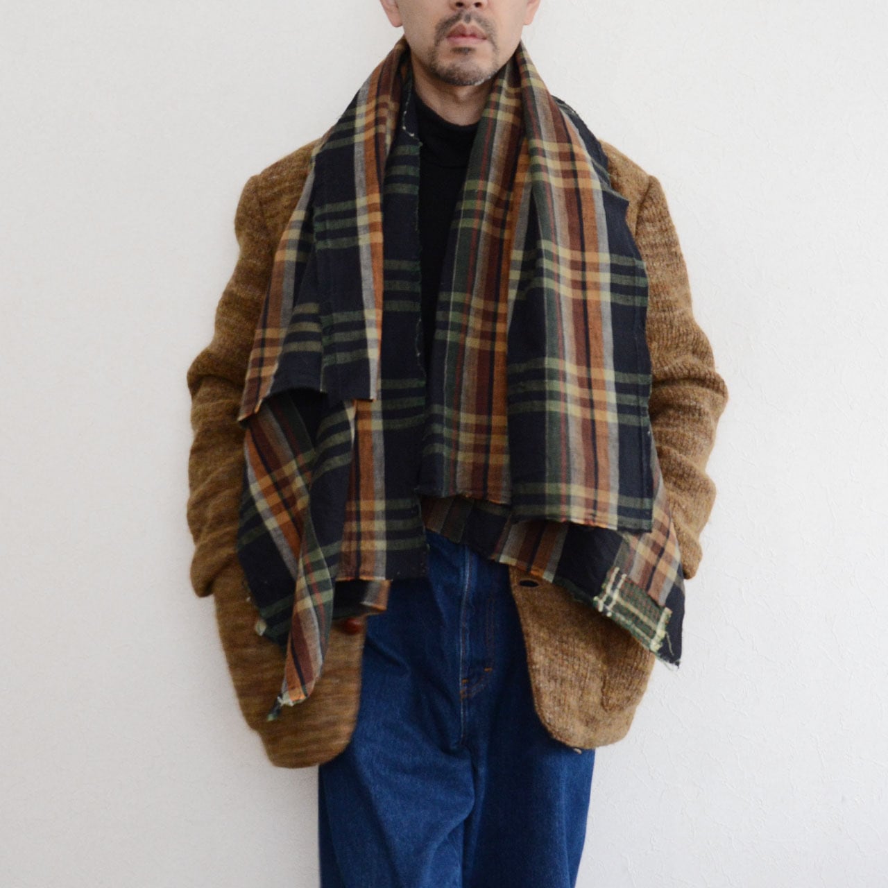 コーディネート例として、インナーにはブラックのモックネックカットソーを合わせ、さらに古布をストール感覚で巻くと、ヴィンテージ感を活かしつつ個性的なスタイルに仕上がります。クラシカルな80年代の雰囲気を残しつつ、現代のカジュアルスタイルにも合わせやすいデザイン。コレクターズアイテムとしてもおすすめです。