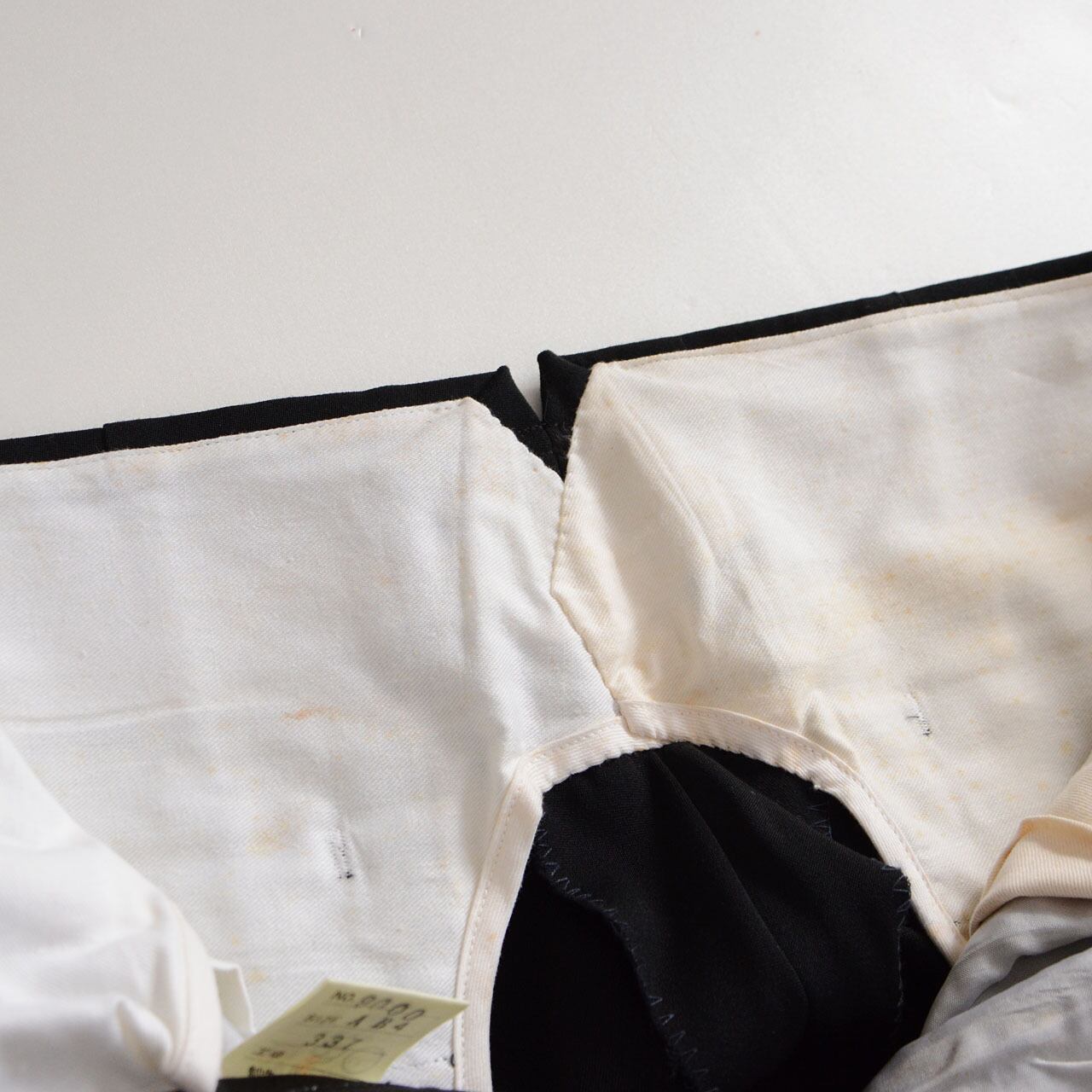 ウエスト後部にはクラシックなテーラード仕様であるVカットを採用。座った際や長時間の着用でもストレスを感じにくく、現代の量産品ではほとんど見られない職人の丁寧な仕立てが光ります。