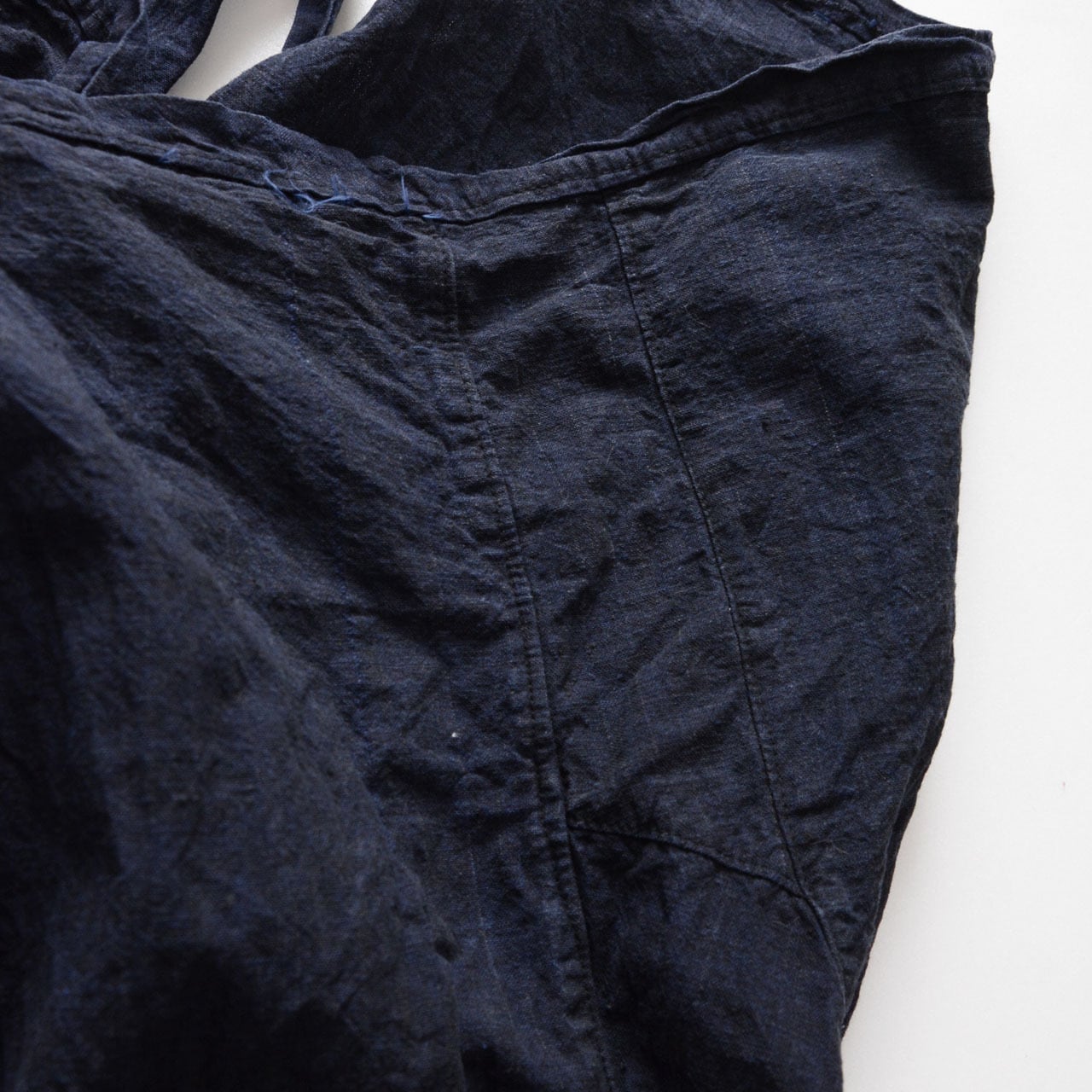 身体に密着させて着用することで動きが妨げられず、布の余りが出ないため、作業効率を高める形状となっています。紐で結んで調整する仕様は、体型や用途に合わせた自由さを持ち、昔の生活道具としての合理性を感じさせます。