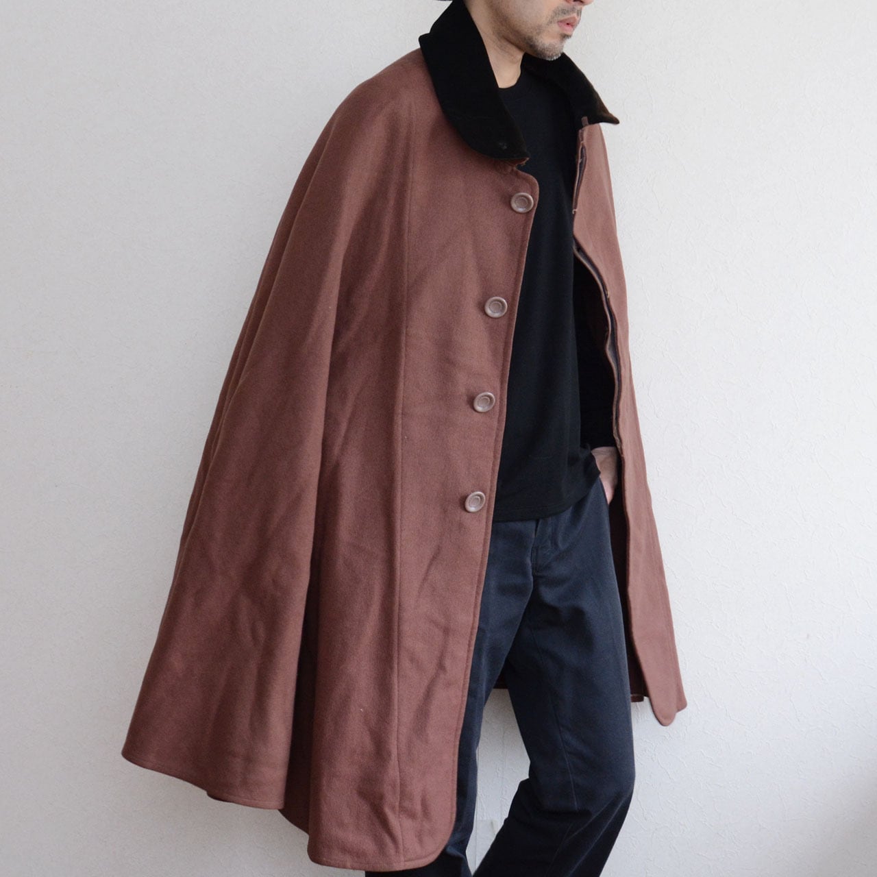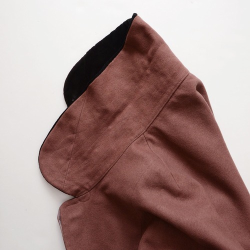肩から自然に落ちるケープ状のフォルムは、身体の動きに合わせて柔らかく揺れ、過度な装飾を持たない分、佇まいそのものに存在感があります。