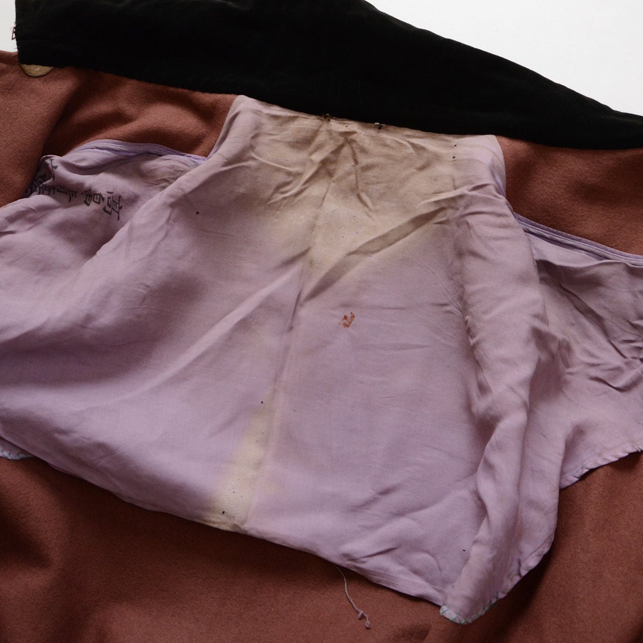 ライニングに汚れや小穴ございます。以前の所有者の方のお名前等が記入されております。(画像では加工させていただきました。)