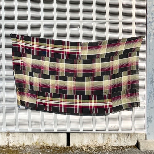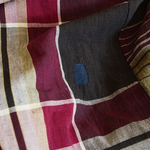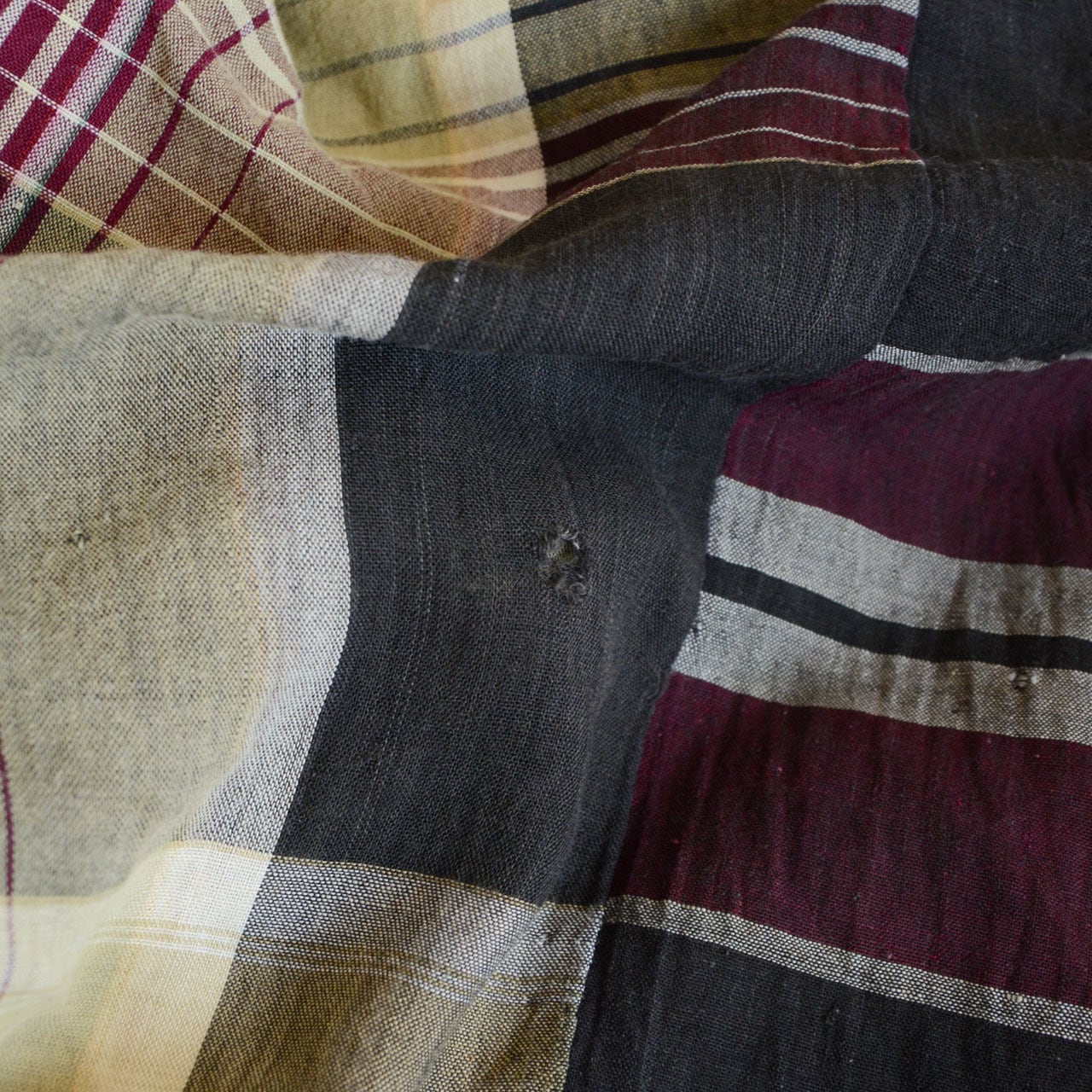 格子模様の木綿には、長い時間の中で生まれたフェード、小さな穴や補修の跡が残っています。