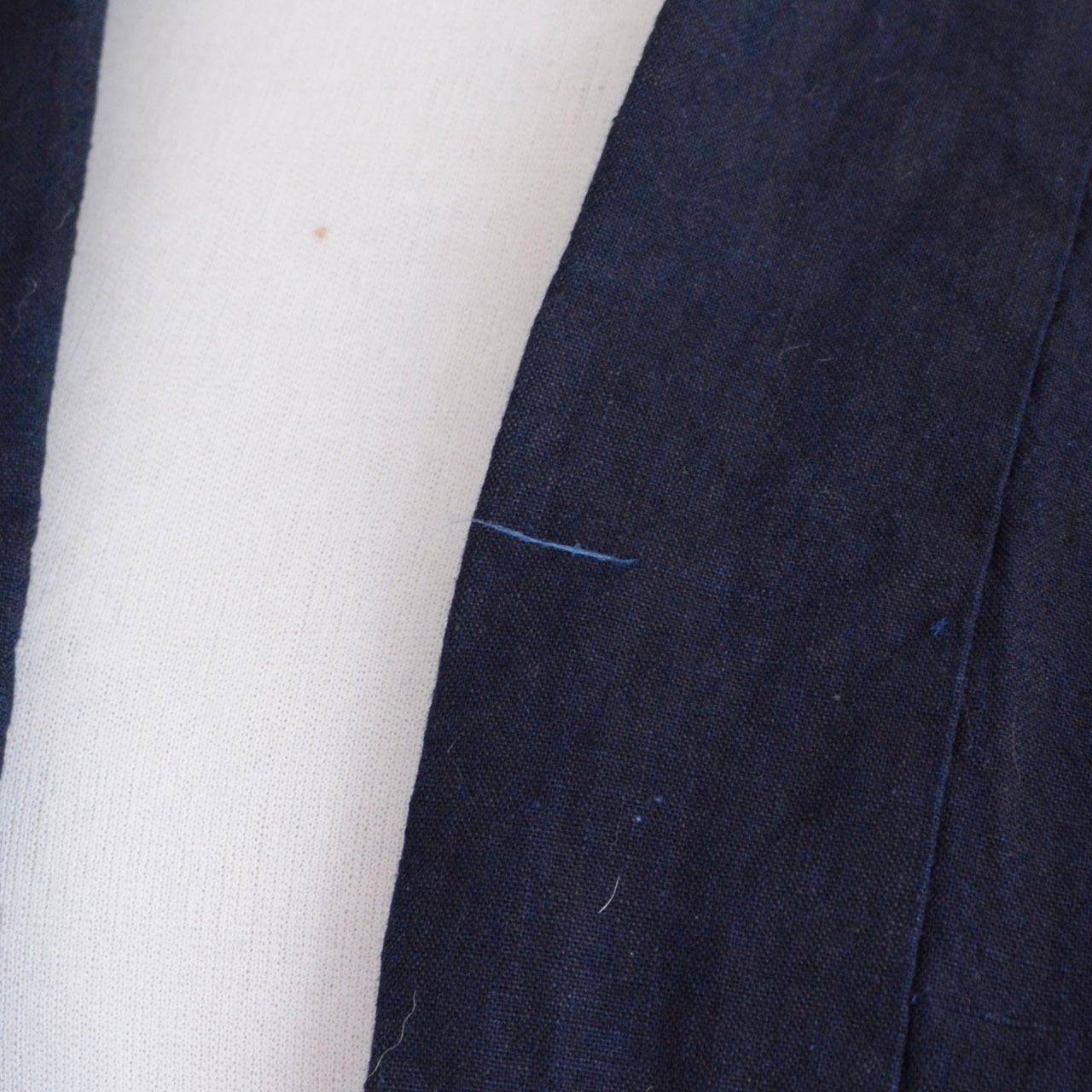 一見すると強い藍の発色は感じられませんが、生地の解れから、確かに藍染であることが確認でき、長い時間を経て色が沈み、素材そのものの表情が前に出た一着です。