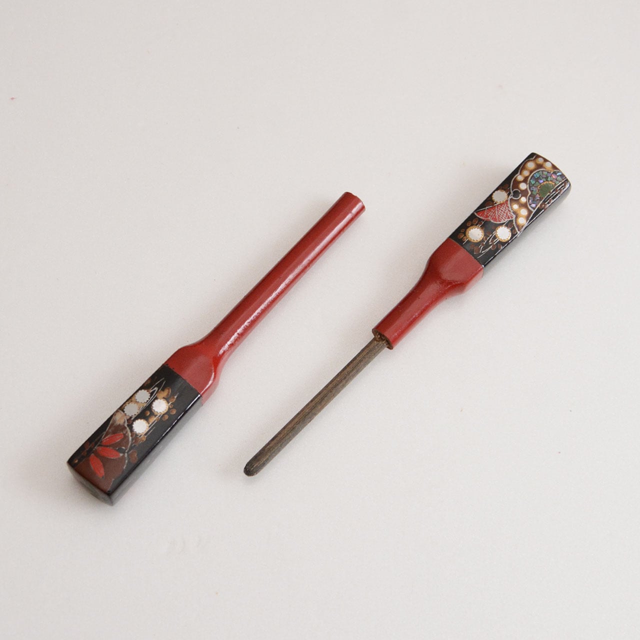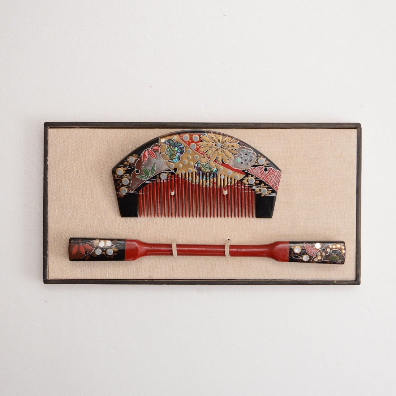 日本の髪結い文化の中で使われてきた、漆塗り・蒔絵が施された櫛と笄(こうがい)のアンティークセットです。