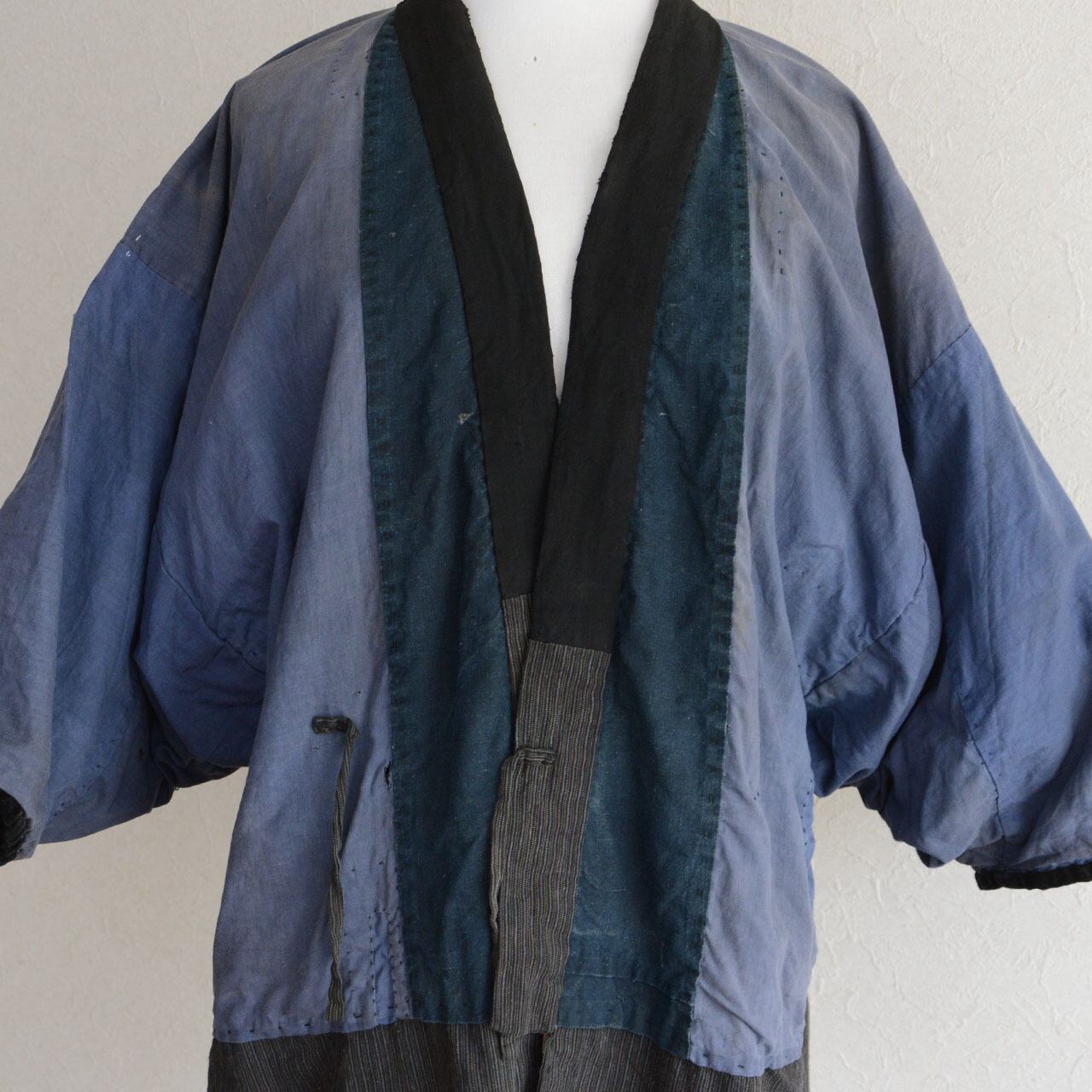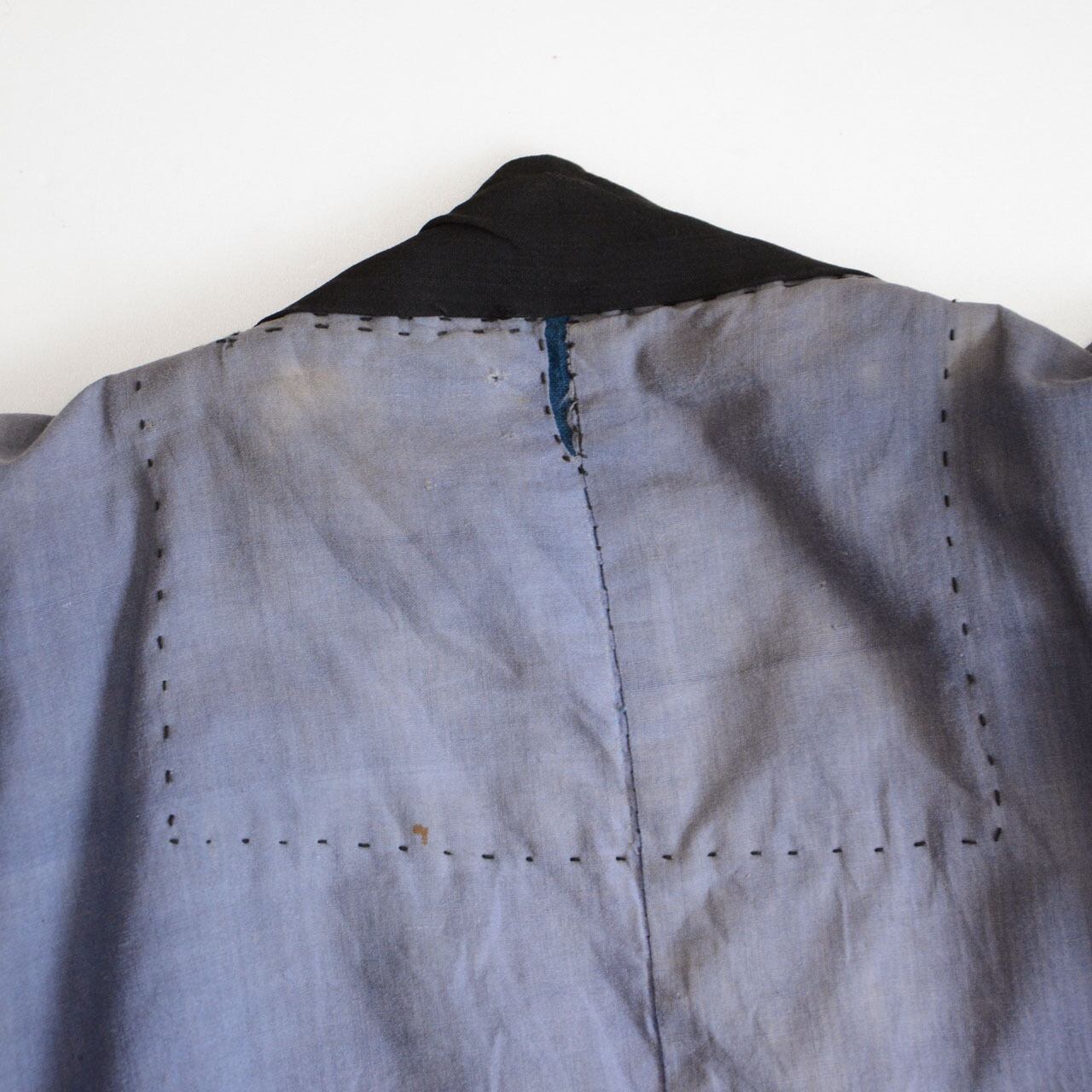 全体に手縫いの縫製が残っており、当時の家庭仕事による仕立ての温かみを感じられる点も魅力です。農作業着として実際に使われてきた背景を感じさせる、雰囲気のある一着です。