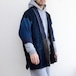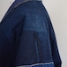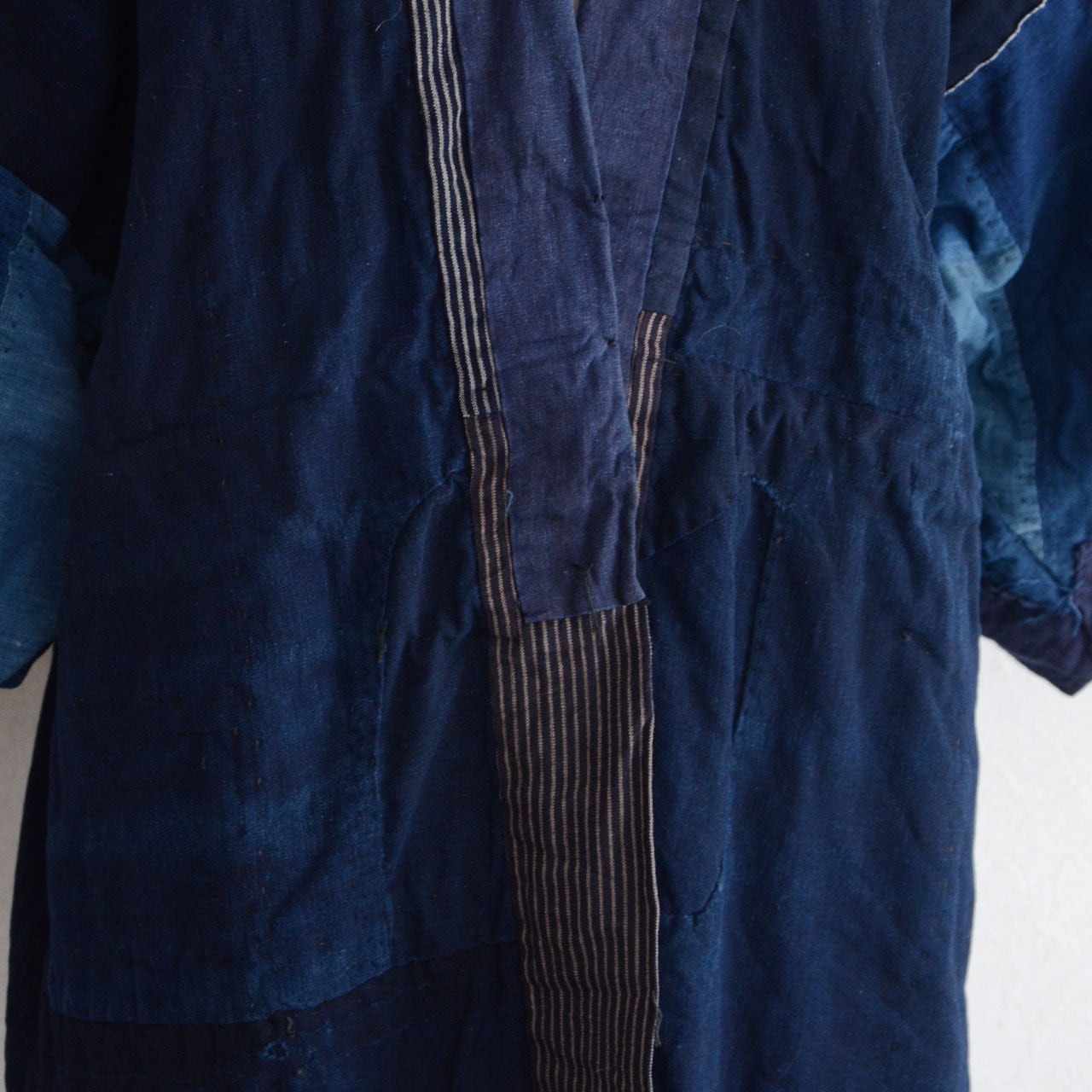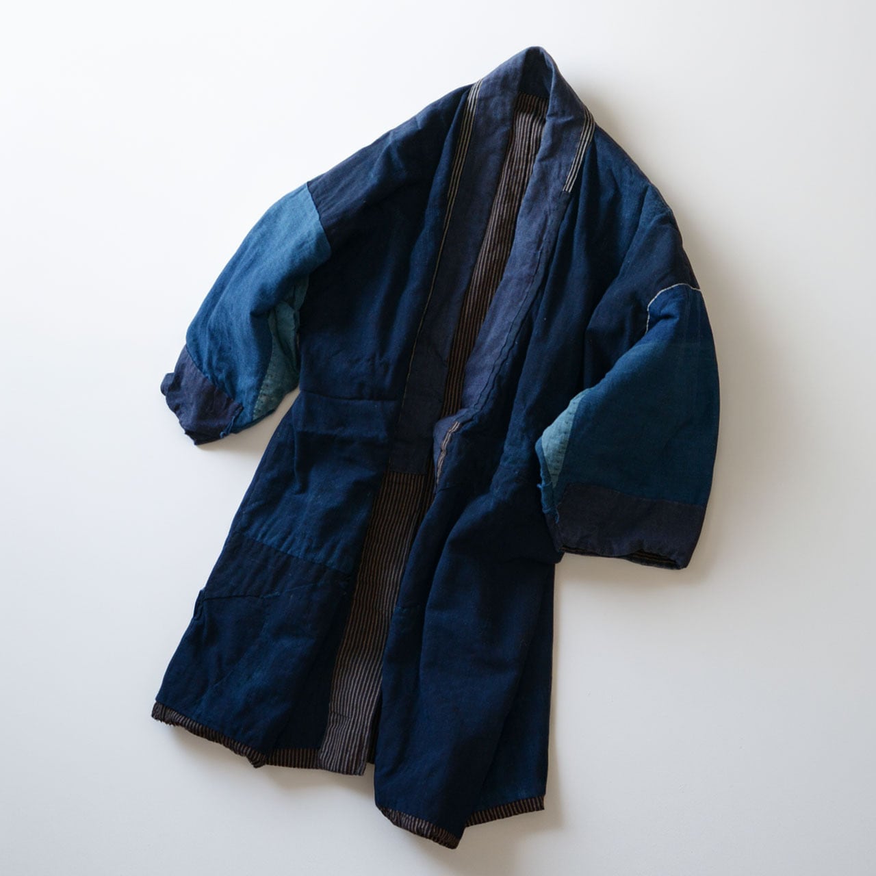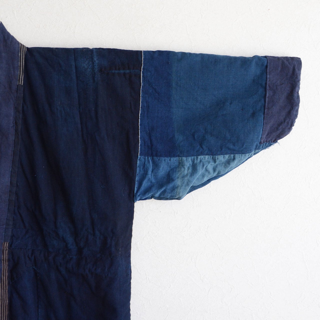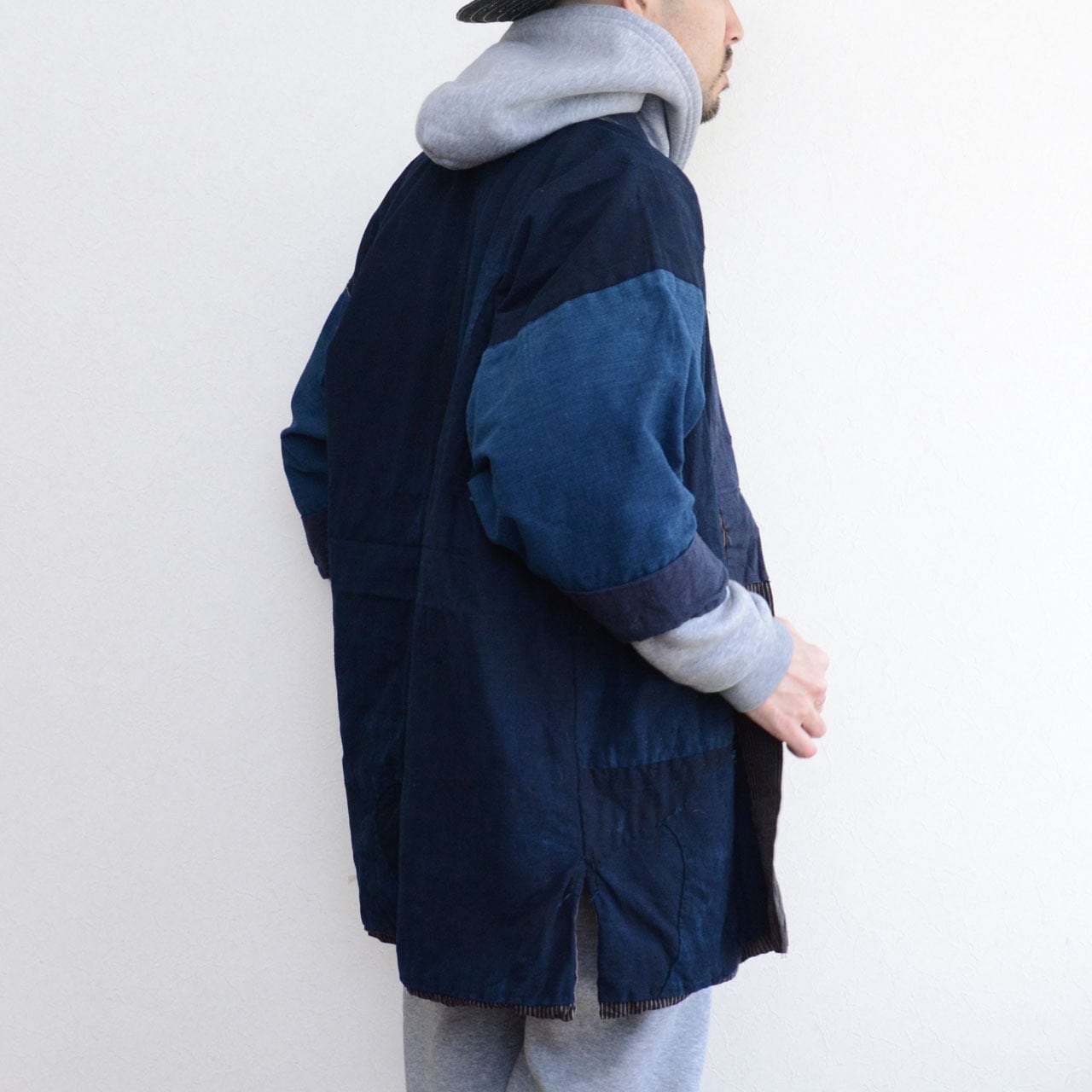 裏面には深く美しい藍染の無地生地が使われており、袖部分はやや淡い藍、身頃は濃い藍と、まるで三色の藍が重なり合うような独特の表情を見せています。