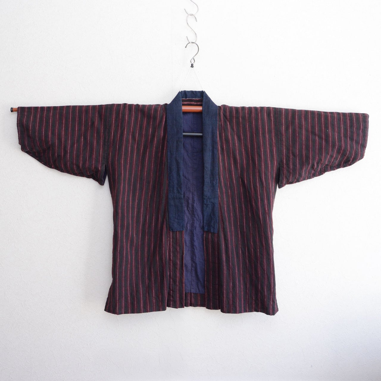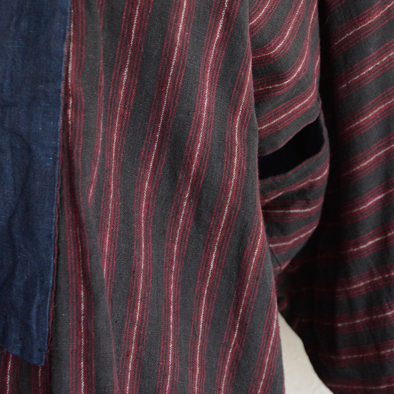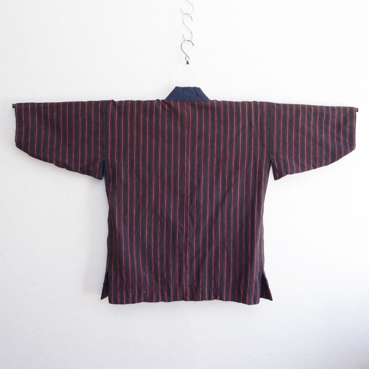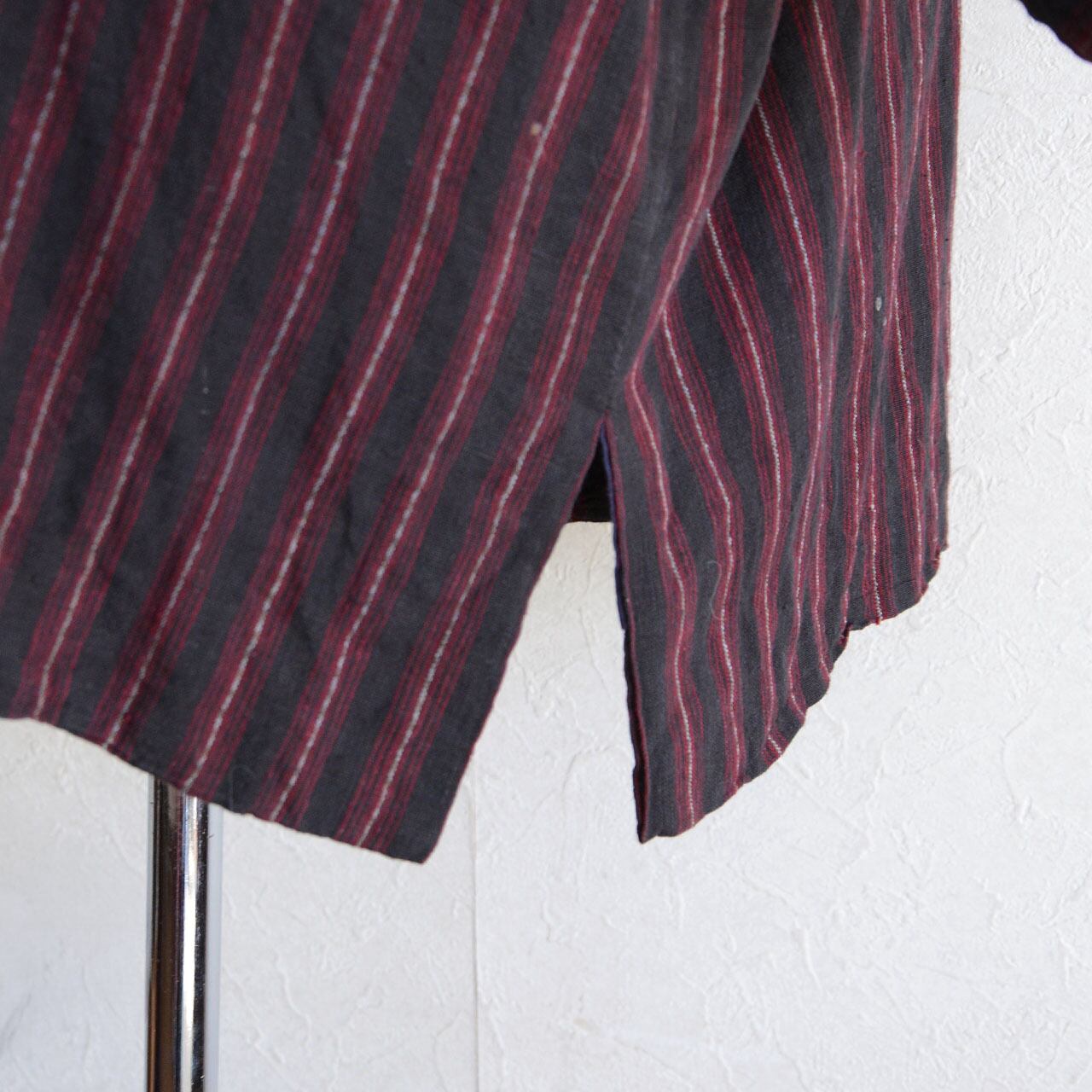 生地には、濃いチャコールグレーとレッドを組み合わせた縞模様の木綿が使われており、日本の古布ならではの力強い雰囲気を感じさせる一着です。落ち着いた色味の中に赤の縞がアクセントとなり、非常に印象的なファブリックです。