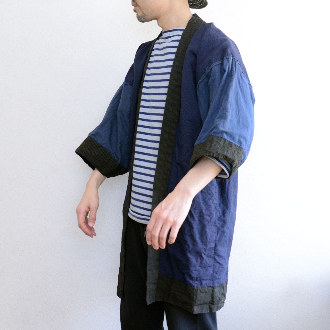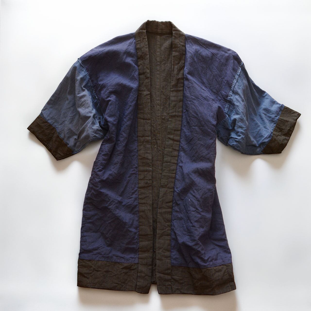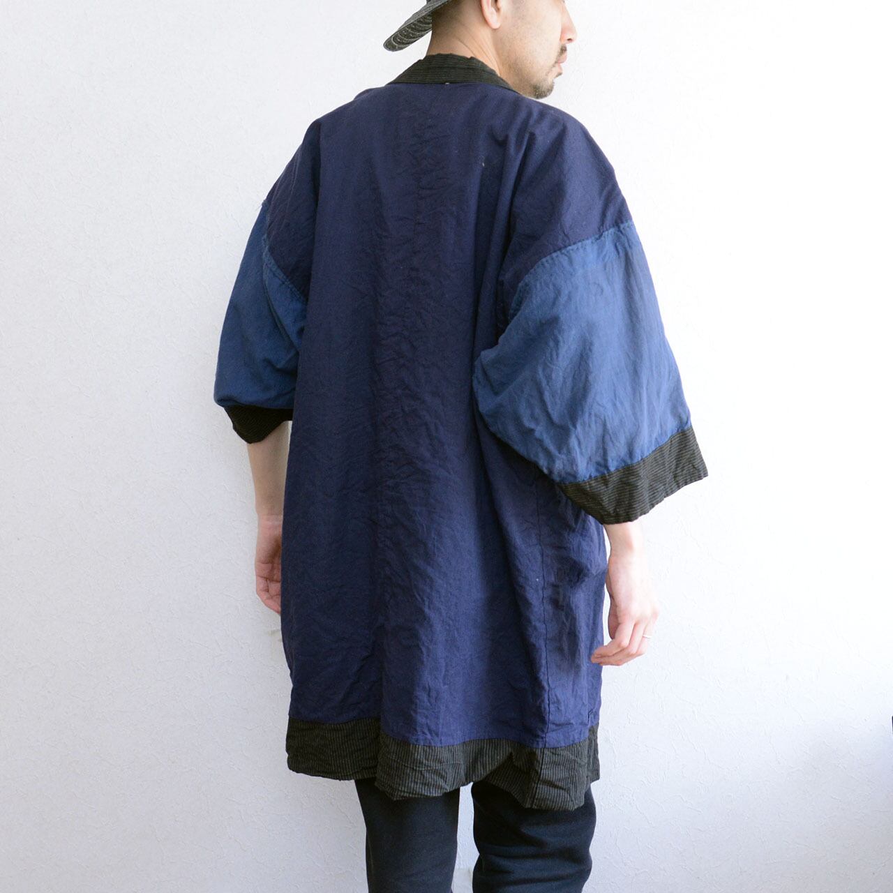 ボディと袖、異なる縞生地を組み合わせたこの野良着は、