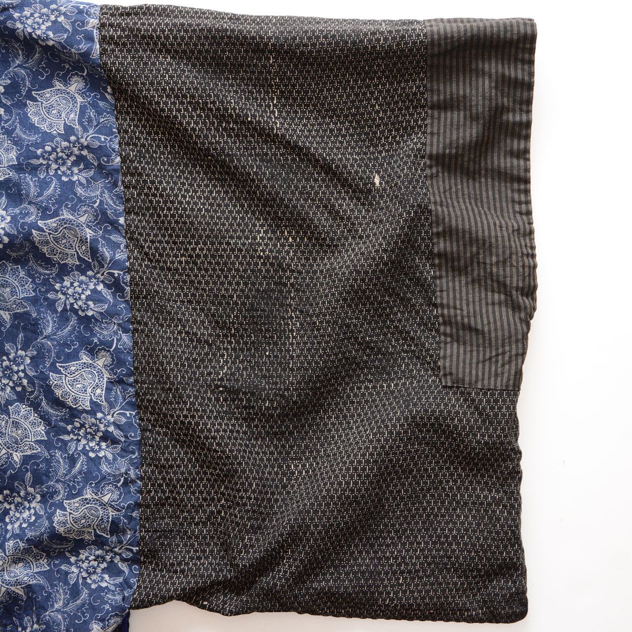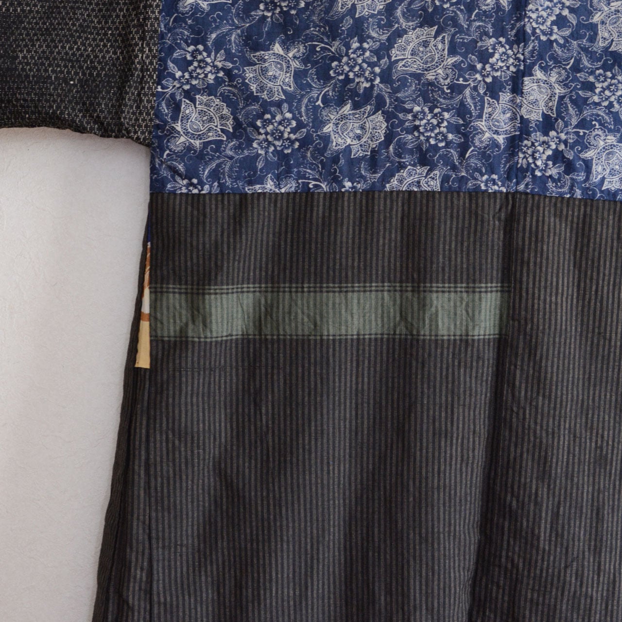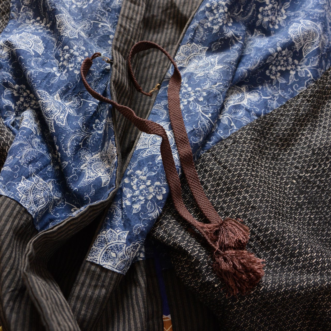 当時、東北の農村では、使える布はすべて使いました。 表は縞。裏には、異なる生地が静かに共存している。 複数の異なる布が、一枚の羽織の内側に縫い合わされています。
