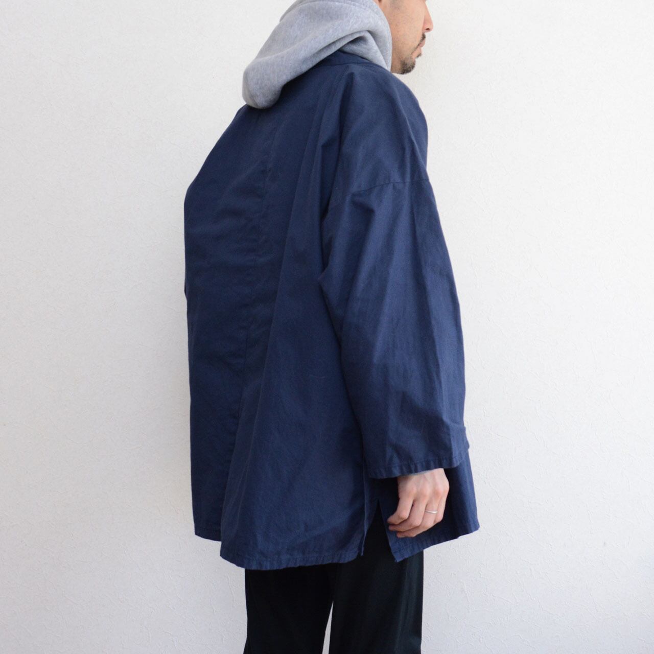落ち着いたネイビーカラーと木綿素材の組み合わせにより、日常に取り入れやすい一着に仕上がっています。