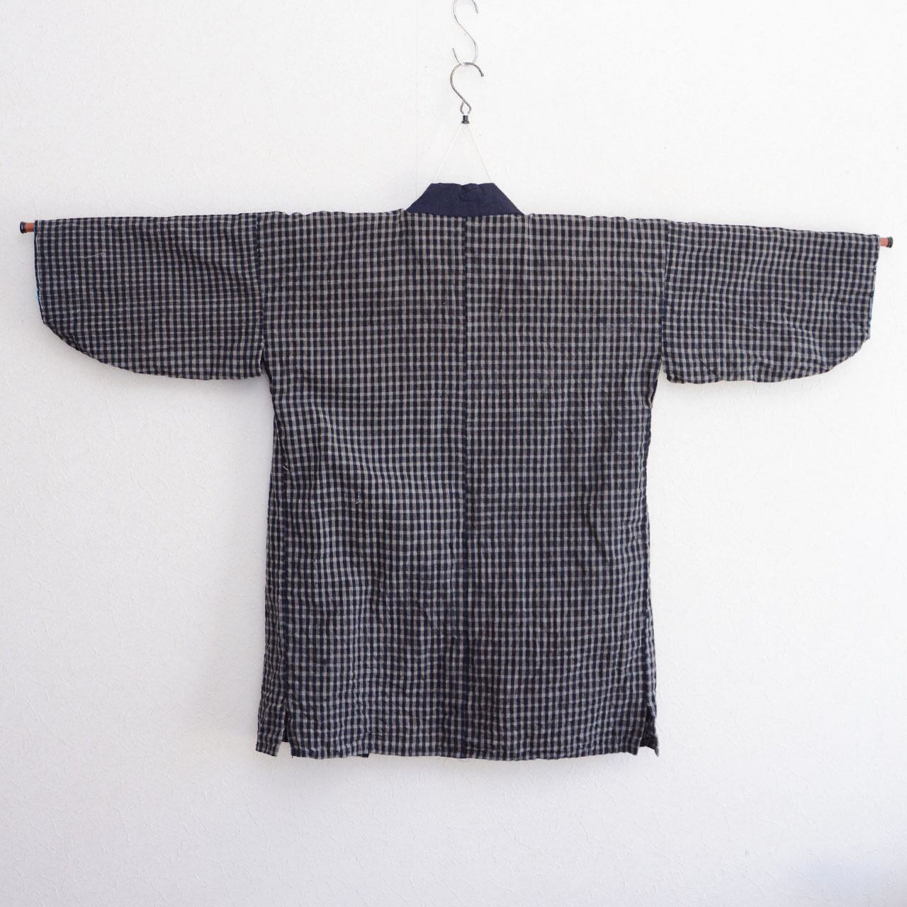 野良着 格子模様 木綿 手縫い 昭和中期 ジャパンヴィンテージ|藍染襟・国会議事堂参観記念手ぬぐい裏地