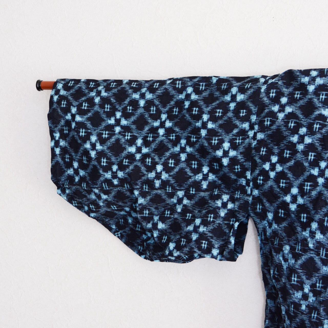 中央には伝統的な井桁絣が配され、その周囲が囲まれた独特な文様が連続する、非常に珍しい構成。一般的な絣には見られない、静かでありながら印象に残るリズムを生み出しています。