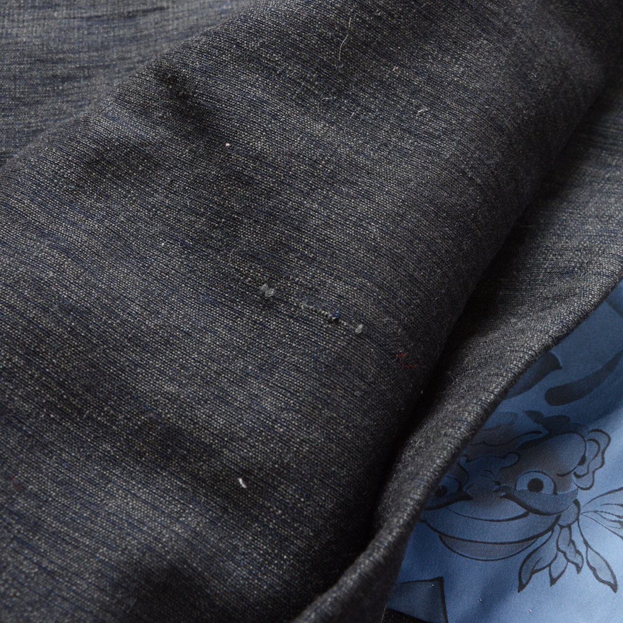 鮮やかなブルーの裏地に、複数の達磨が描かれ、「七転び八起き」の文字が躍ります。表地の静けさと、この裏地の気骨——その落差こそが、日本の男性ヴィンテージが長年にわたってコレクターを魅了し続ける理由です。見せない場所に本気を込める。それが粋というものでしょう。