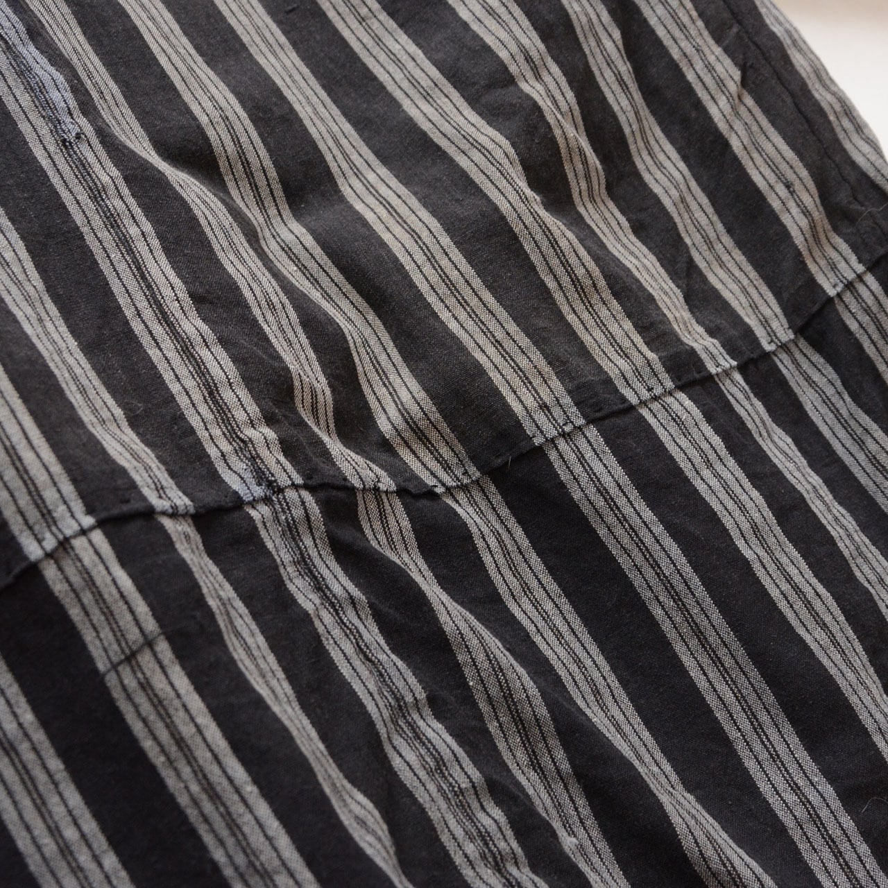 計算されたのか、無造作なのか、もはやわかりません。ただ、そこには確かに誰かの手がありました。さらに、襟の一部には藍染絣の生地。仕事着の中に、静かな美意識が宿っています。