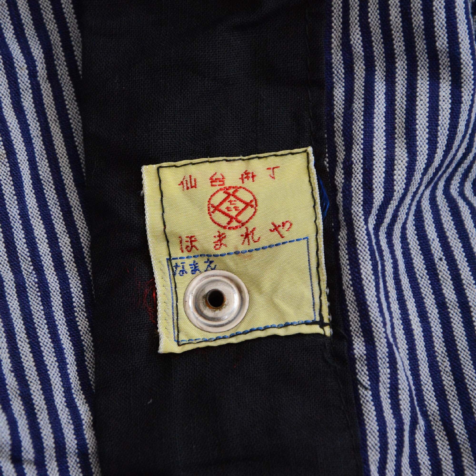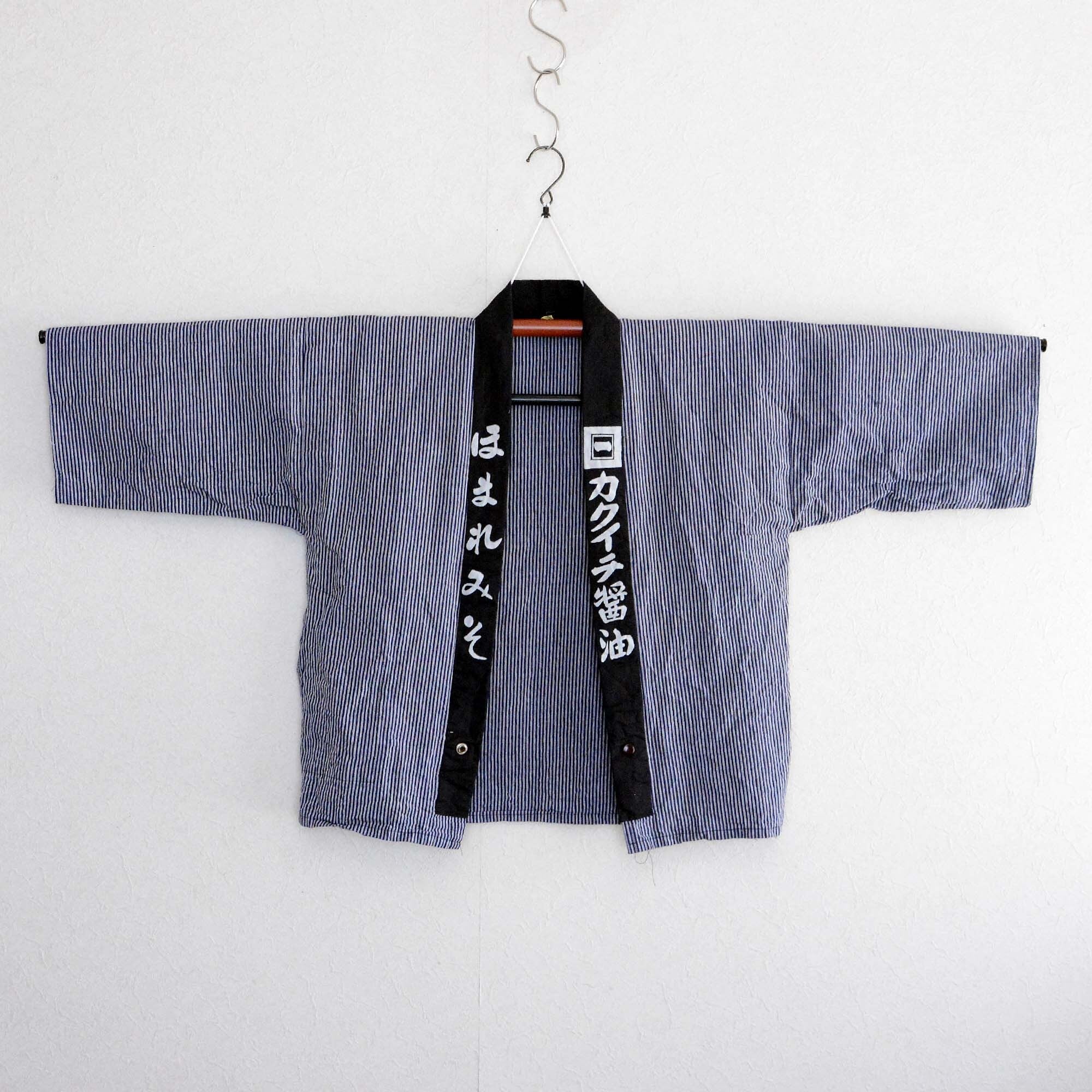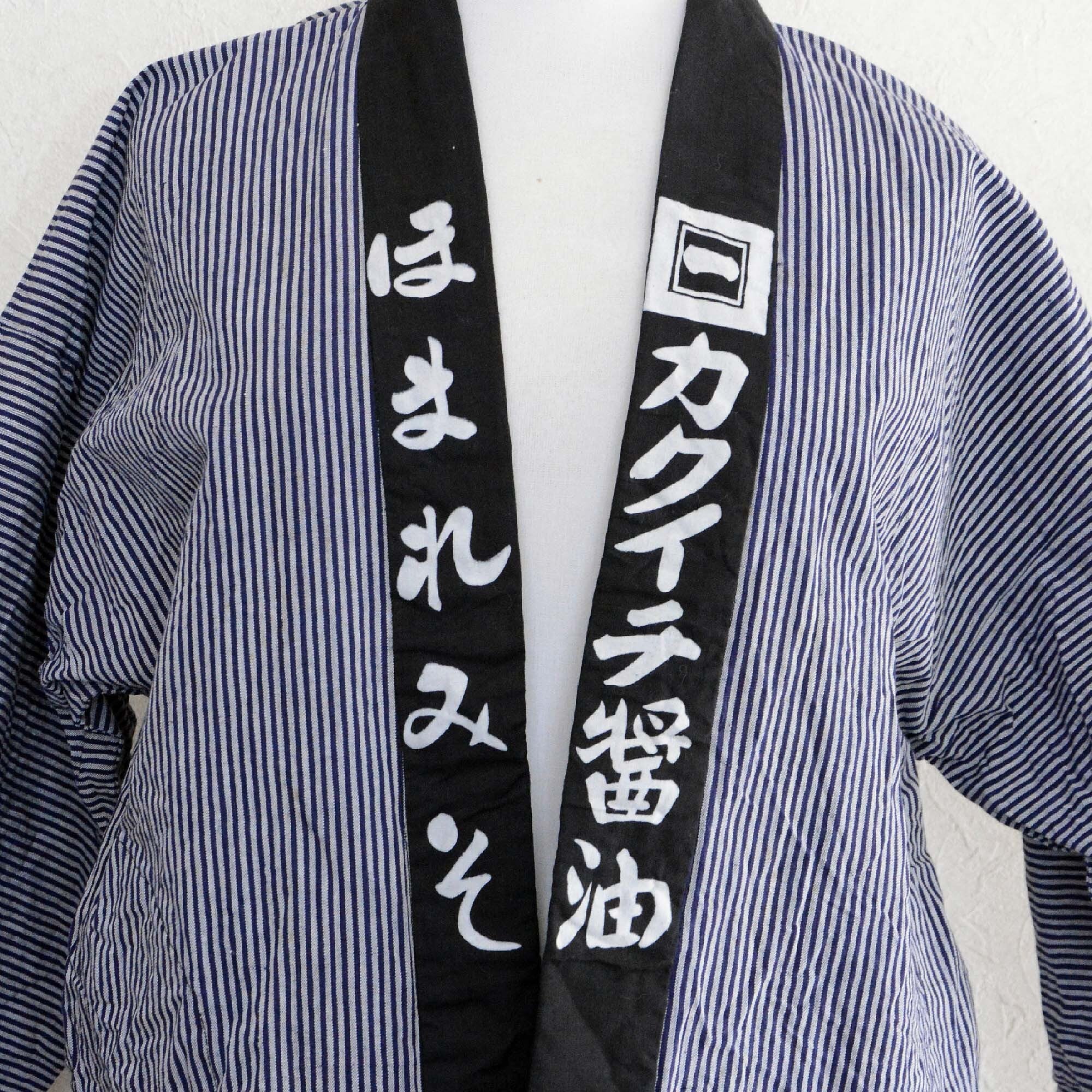 法被 半纏 昭和レトロ カクイチ醤油 ほまれみそ 縞模様 ジャパンヴィンテージ リメイク素材 | happi coat men hanten jacket cotton japan vintage