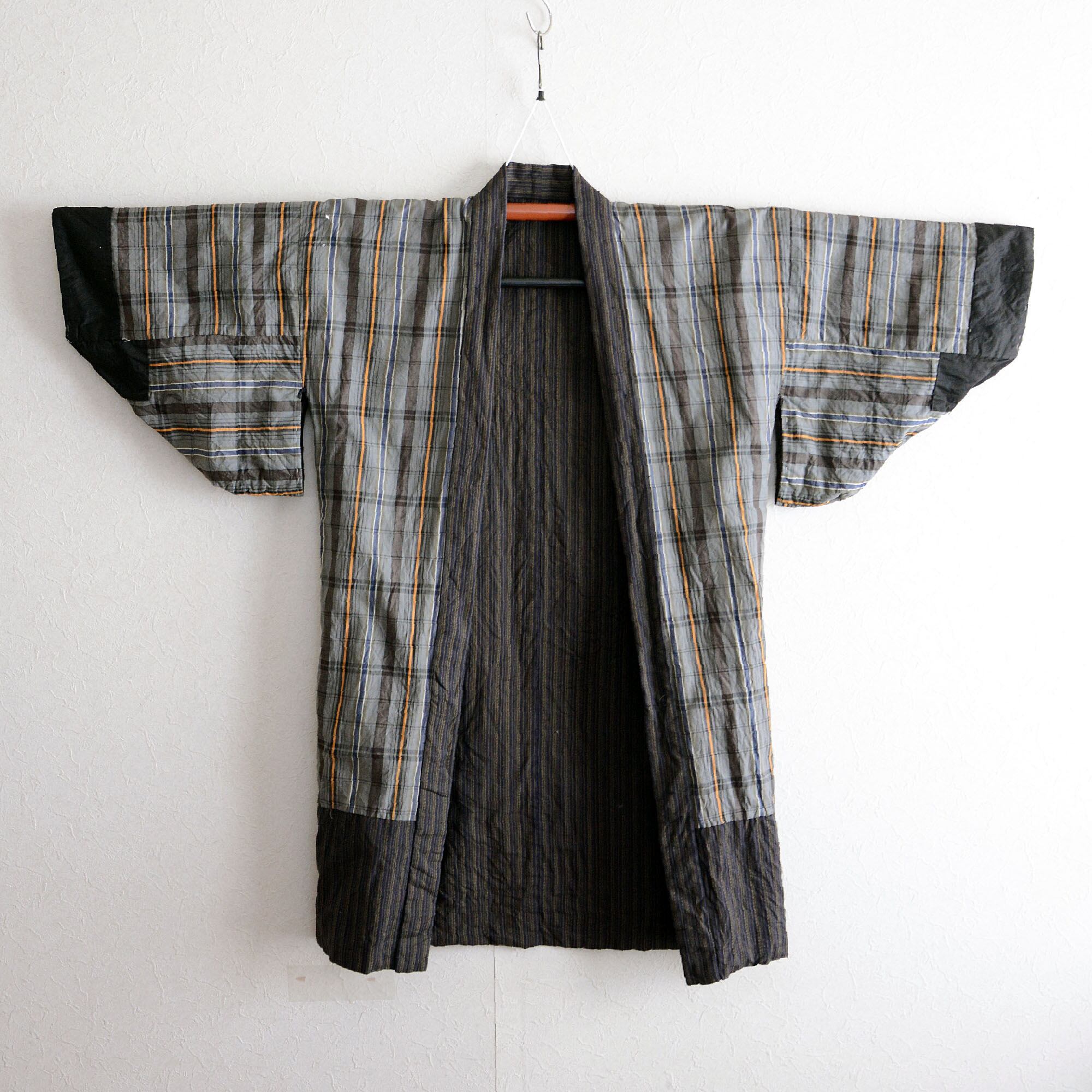 野良着古着木綿着物ジャケット格子縞模様ジャパンヴィンテージ昭和リメイク素材 | noragi jacket kimono cotton japanese fabric vintage checkered pattern stripe