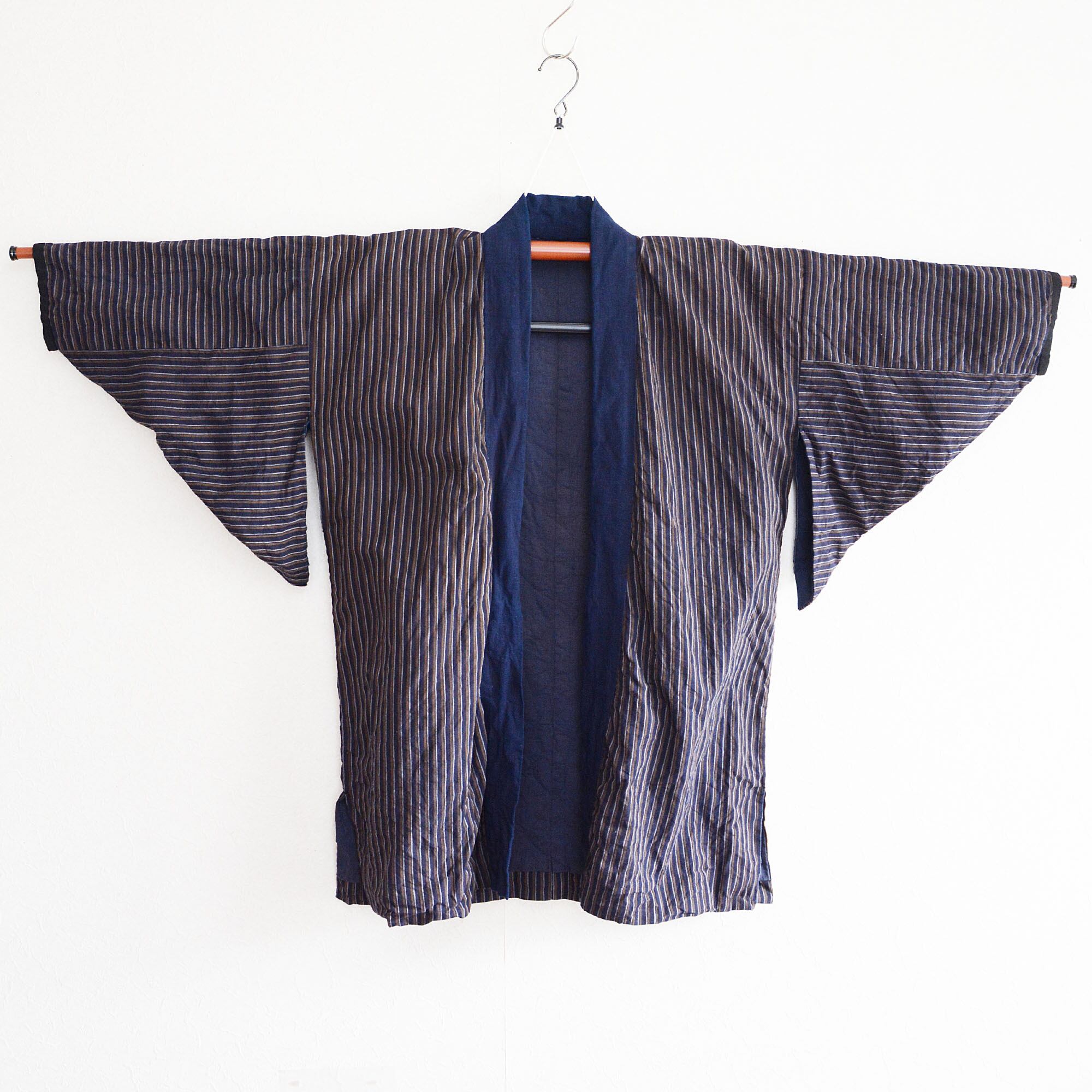 裏面のフェードした色味も雰囲気がありますし、表面の古布らしい縞模様も素敵です。(藍染ではございません。)